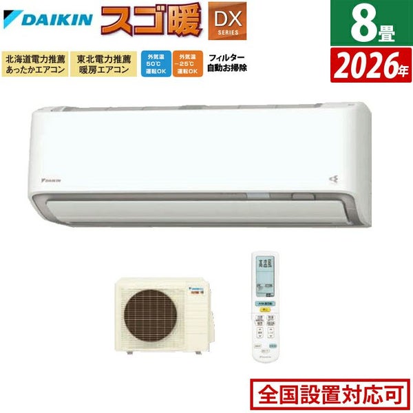 他の画像を見る 延長保証・設置申込可!送料無料・アフター対応 エアコン 8畳用 ダイキン 2.5kW 寒冷地仕様 スゴ暖 DXシリーズ 2026年モデル S256ATDS-W-SET ホワイト 当店特別価格 ¥ 189,430 税込 延長保証・設置申込可!送料無料・アフター対応 詳細を見る お気に入りに登録する