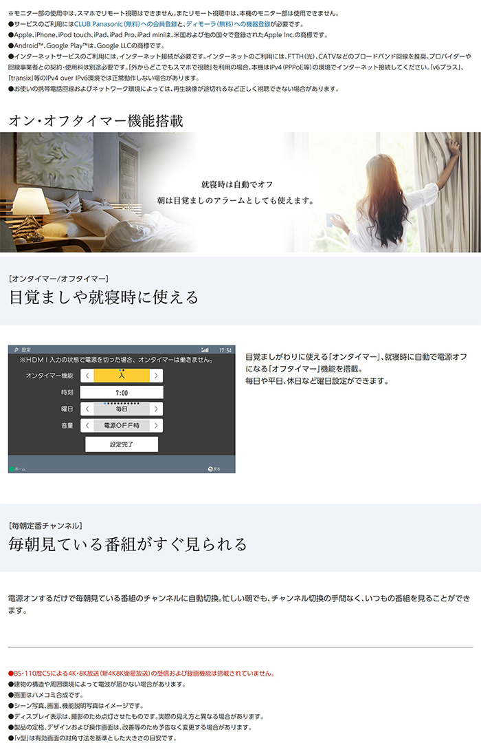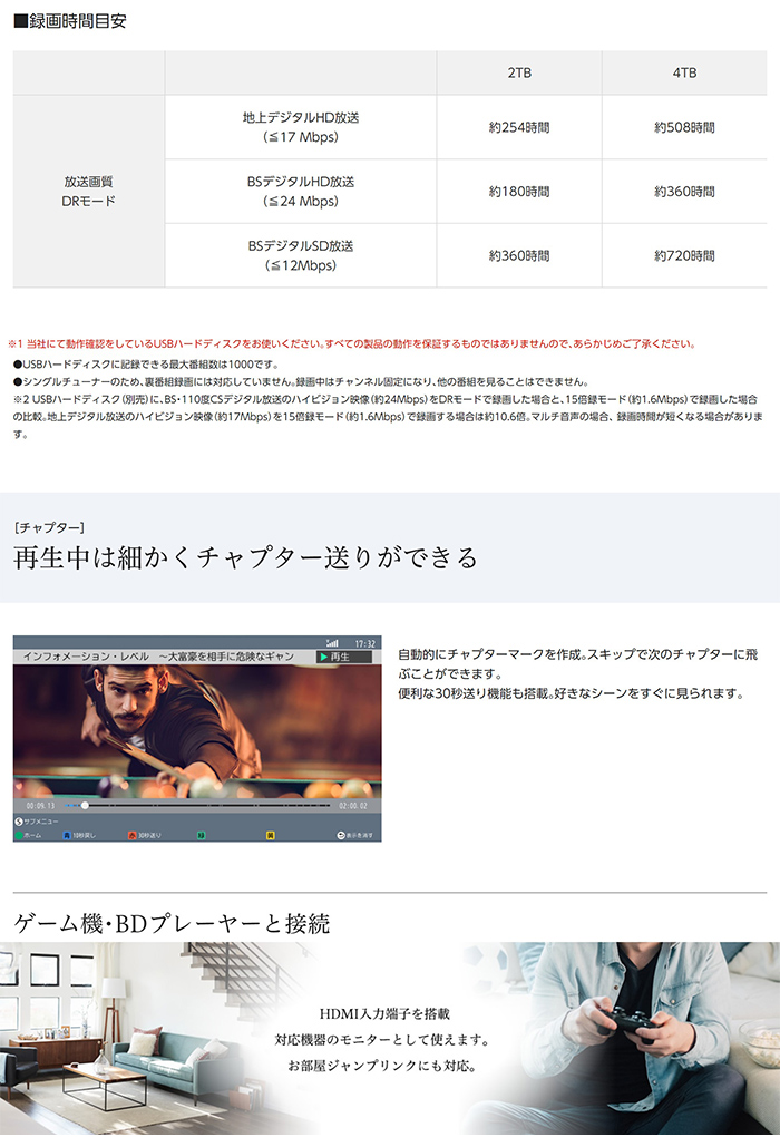 ■自分専用ゲームモニターとして使えるHDMI入力端子搭載■アンテナ線がない部屋でも大画面で見られるスタンダードモデル【仕様】◎チューナー部 仕様■録画圧縮方式:MPEG2 (DRモード)、MPEG4-AVC/H.264 (1.5倍録~15倍録モード)*USB-HDD(別売)使用時■録音方式:MPEG-2 AAC(最大5.1ch記録)*USB-HDD(別売)使用時■放送受信チューナー数:地上デジタル/BSデジタル/110度CSデジタル:1■入出力端子・アンテナ入力端子:地上デジタル/BSデジタル/110度CSデジタル 75Ω F型コネクター 混合1系統・HDMI AV出力:1系統・USB端子:○(後面1系統、USB-HDD用) (DC 5V 最大500mA)・LAN端子/電話回線端子:-/-■電源:DC 12V■消費電力:動作時:約9W (本体 約8W)*付属の専用ACアダプター使用時■待機時消費電力・約4.0W*標準待機時(電源ランプ点灯)、地上デジタルアッテネーター:入、BS・110度CSデジタル放送アンテナ電源:切、外部接続端子(USB):未接続、LAN接続形態:無線親機、HDMI出力解像度:1080iの場合。・約0.4W*節電待機時(電源ランプ消灯)、地上デジタルアッテネーター:入、BS・110度CSデジタル放送アンテナ電源:切、 外部接続端子(USB):未接続、無線LAN:未接続の場合。*節電待機時の数値は、お客様の設定により変わります。■外形寸法(幅×高さ×奥行):幅136 mm×高さ42 mm×奥行き117 mm(突起部含まず)/幅136 mm×高さ43 mm×奥行き119 mm(突起部含む)■質量:約0.3 kg◎モニター部 仕様■電源:DC12V(DC IN端子)/DC7.34V(充電式電池端子)■消費電力:動作時:約20.5W(本体約18W)*付属の専用ACアダプタ使用時■外形寸法(幅×高さ×奥行):幅446 mm×高さ299 mm×奥行き35.6 mm(突起部含まず)/幅446 mm×高さ301 mm×奥行き46.4 mm※1(突起部含む)■質量:約1.8kg■液晶ディスプレイ(アスペクト比16:9):19v型※2■画素数:横1366×縦768■スピーカー:音声実用最大出力(JEITA):3W+3W■出力端子:ヘッドホン出力 ステレオミニジャック(Ф3.5mm、16~32Ω推奨) 端子数:1系統■入力端子:HDMI入力端子 端子数:1系統(19ピン、typeA端子)■防水:-■無線LAN対応:○(内蔵、IEEE802.11ac/IEEE802.11n/IEEE802.11a*/IEEE802.11g/IEEE802.11b準拠)*従来の11a(J52)のみの対応機器とは接続できません*5GHz帯は屋内使用限定です。■DLNA対応:-(*お部屋ジャンプリンク対応)■USBハードディスクについて※3■付属品:【チューナー部用】ACアダプター, mini B-CASカード, 【モニター部用】ACアダプター※4,, 【チューナー・モニター部兼用】リモコン, 単3形乾電池(2本)※1 スタンド使用時奥行き112mm※2 「v型」は有効画面の対角寸法を基準とした大きさの目安です。※3 当社にて動作確認をしているUSBハードディスクをお使いください。すべての製品の動作保証をするものではありませんので、あらかじめご了承ください。※4 視聴の際はモニター部にACアダプターの接続が必要です。