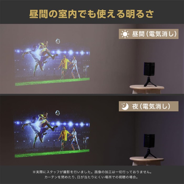 ■連続再生時間コードレス 約1.5時間AC接続時 約8時間コンパクトサイズだから、リビングや寝室など設置場所を選ばずスッキリ設置でき、使いたいときにすぐ取り出せます。さらに、内蔵バッテリー搭載でコードレスで持ち運びも可能!自宅でも外出先でも、大画面の映像を手軽に楽しめます。■壁が無くても工夫すると投影場所は作れます!締め切ったブラインドカーテン家にロールカーテンを設置キャンプ中のテントにもホワイトボードに投影■おすすめアプリ搭載済みWi-Fiに接続してすぐに楽しめるYoutube 、Netflixなどのアプリは既にインストール済み!■Android11搭載その他アプリもGoogle Playストアからインストールが可能です。※ほかのアプリをダウンロードすることも可能ですが、互換性の問題により、完全に動作しない可能性があります。■ミラーリング対応(iPhone/iPad、Android)スマートフォンの画面をワイヤレスで投影。動画や写真なども大画面で楽しめます。※一部スマートフォンやコンテンツには対応していない場合があります。またアプリの追加ダウンロードが必要な場合があります。■有線でも接続可能プロジェクターとスマートフォンを優先で接続することも可能です。USB Type-C付属■大画面で地デジや録画も楽しめる付属のHDMIケーブルで各種プレイヤーとつなぐだけで設定は簡単です。※地デジやBSCSの視聴などには別途チューナーが必要です。■大迫力の100インチ投影10インチ~100インチまで対応■このプロジェクターなら、10インチの省スペース利用も、100インチのダイナミック体験もこれ1台。近距離投影OKなので、設置場所を選びません!■投影方式:DLP■解像度:480P(854×480)■入力解像度:~4K(3840×2160)■最大輝度(ANSIルーメン):120ANSI/lm■光源:LED■LED寿命:30000時間■投影比率:1.2:1(38インチ/1m)■投影サイズ:10~100インチ■アスペクト比:16:9■コントラスト比:400:1■投影歪み:<1%■周辺照度比:>85%■フォーカスモード:マニュアルフォーカス■台形補正:垂直: 自動 ±40°/水平: 手動±40°■投影モード:正面、背面、吊り下げ正面、吊り下げ背面■オペレーションシステム:Android 11■CPU:TV303■GPU:Mali G31■RAM:1GB■ストレージ:32GB■Wi-Fi規格:DUAL-BAND 2.4G/5G■Bluetooth:Bluetooth Ver.5.2■操作性:タッチパット/リモコン/スマートフォンアプリ■ミラーリング機能:Transcreen/Airplay/MiraCast■内蔵スピーカー:3Wx1■内蔵バッテリー:7000mAh■連続再生時間:内蔵バッテリー:約2時間、ACアダプターで使用の場合8時間まで■消費電力:12W■騒音:30dB■入力電圧:DC12 2A■ビデオフォーマット:H.264、H.265、Vp9、MPEG1、MPEG2、MPEG4、H.263、XVID、VP8■音楽フォーマット:MP3、AAC.OGG、FLAC、APE■画像フォーマット:jpg、png、bmp、etc■入出力端子:HDMI端子(TypeA)x1/USB端子(TypeA)x1/ 3.5mm オーディオx1 / DC 電源入力端子x1■付属品:取扱説明書、リモコン、リモコンテスト用電池(単4形x 2本)、HDMIケーブル、ACアダプター、3脚(雲台)、スマートフォン有線接続用ケーブル■本体サイズ:幅74x奥行74x高さ110mm■本体質量:450g