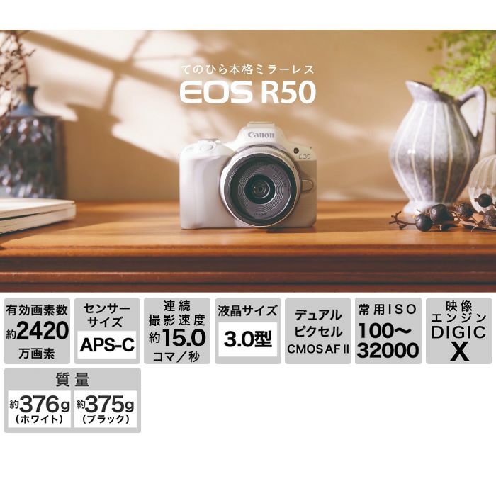 他の画像を見る 送料無料・延長保証申込可 キヤノン カメラ EOS R50 ダブルズームキット ミラーレスカメラ EOSR50WH-WZK ホワイト 当店特別価格 ¥ 146,800 税込 送料無料・延長保証申込可 カートに入れる お気に入りに登録する