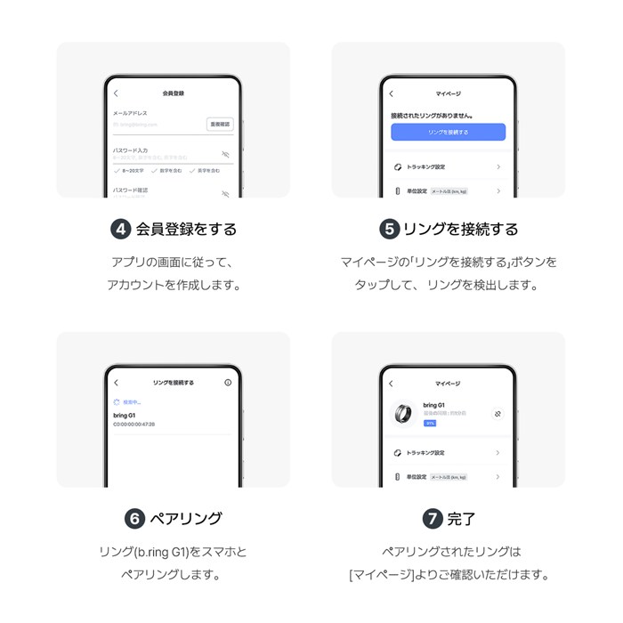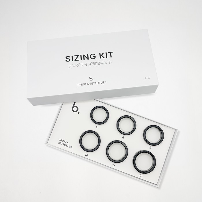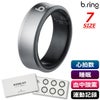 ■セット内容・b.ring ブリング スマートリング 7サイズ チタン B074TNSVRNG マットシルバー・スマートリング サイズ計測キット B03PBKKIT (サイズ合わせ用のb.ring専用サイジングキットです。)■指先から始める、健康的な毎日。ブリングでいつでもどこでも簡単に体のコンディションをチェックしましょう。■b.ring(ブリング)とは健康データを取得・分析可能な健康管理用スマートリングです。■重さわずか約3g~5g、指にはめるだけで健康状態をリアルタイムで計測できます。■b.ringは、つけてるだけで生体情報を分析し毎日の健康をサポートするスマートリングです。日常生活に最適な着け心地とスタイリッシュなデザインが特徴です。■リアルタイムで健康管理・・・ブリング専用アプリで心拍数、睡眠データ、運動データなどさまざまな健康データを一目で確認!いつでもどこでも、簡単に健康状態をチェック・管理できます。ブリングで手軽に健康的な毎日を築きましょう。■(1)睡眠データを記録(2)心拍数モニタリング(3)血中酸素をチェック(4)ストレス管理(5)運動記録(6)歩数を記録■データ処理は日本国内のサーバーにて行われるため安心■シャワー時にも使えるIP68防水■スマホと安定的につながるBluetooth5.1使用■約2時間の充電で最大7日間使用可能■総務省の技術基準適合証明獲得(003-240204)■軽量で耐久性に優れたプレミアムチタン素材を採用しています。■腐食に強く肌にもやさしいため、長時間着用しても快適に過ごせます。■日常使いからアウトドアまで、幅広くご使用頂ける実用性の高いアイテムです。■サイズ:リングの寸法/幅8×厚さ2.8mm、内径/17.4mm、内周指周り/54.5mm、■重量:2.9~5g(サイズにより異なる)、■材質:チタニウム、■バッテリー:リチウムポリマー(技術基準適合証明番号 003-240204)、■バッテリー容量:17.5mAh、■充電時間:約2時間、■バッテリー駆動時間:最大7日間、■メモリ(ROM+RAM):128kb ROM+ 96kb RAM、■データ保存期間:最大7日間、■防水等級:IP68、■動作温度:0~50℃、■BT無線通信:Bluetooth5.1、■対応OS:Android 6.0以上、ios13以上、■同梱物:本体、充電ケーブル、取扱説明書、■保証:6ヶ月※注意事項・心拍数は1日分、それ以外のデータは7日間リングに保存されます。アプリとリングデータを毎日同期する事をお勧めしております。・リングを小さなお子様やペットが飲み込まないようご注意ください。・本製品の測定結果はあくまでも参考用として提供されるものです。医療目的で使用したり、医師の指示の根拠として使用しないでください。また、この測定結果を自己診断や治癒の根拠としないでください。・深海への潜水時など、水中での長時間使用には適しておりません。また、加熱した水に入れないでください。・リングに衝撃を与えたり、破損が発生した場合は防水性能が低下する可能性があります。・ヘアドライヤーなど、熱風でリングを乾かさないでください。・本製品はセラミックを使用している為、硬度の高い物質による衝撃を受けると破損する可能性があります。・充電の際には必ず高温多湿な場所を避けてください。また、充電器や充電ケーブルを濡らさないようご注意ください。
