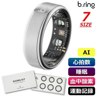 ■セット内容・b.ring ブリング AIスマートリング 7サイズ G2 第二世代 B075SSV2 シルバー・スマートリング サイズ計測キット B03PBKKIT (サイズ合わせ用のb.ring専用サイジングキットです。)■あなたのライフスタイルにフィット。あなたの指先をより美しく完成させます。起きている時も、眠っている時も、一日中身につけても負担にならない快適さで、あなたの日常に自然に溶け込みます。■安心して、気軽に使える(1)90分の充電で、最長7日間持続するバッテリー。充電は短く、仕様は長く。一度の充電で最長7日間つけっぱなしも可能です。※ご利用環境により前後する場合があります。(2)防水・防塵(IP68+5ATM)。日常でも、アウトドアでも。ほこりを寄せつけず、水にも強い。信頼できるタフな設計で、あなたの毎日に安心を。(3)アプリと同期しなくても、最長7日間データを保存。(心拍数のみ3日間)。通常の使用状況においてデータ消失のリスクを軽減できるように、データを自動で保存します。■高精度なバイタルデータ測定(1)光血流センサー、加速度センサーなど精密なセンサーを搭載。小さなリングに搭載された精密なセンサーが、動作からバイタルサインまで指先で繊細に感知します。(2)生体信号をより正確に測定できる部位にフィット。信号を捉えるのに最適な‘‘指‘‘。指にしっかりフィットする事で高精度な計測を実現します。(3)眠りの時間も、パターンも。より細やかなデータであなたの睡眠を解析。細かく計測するパーソナライズド・スリープモニタリング。繊細な睡眠リズムをわかりやすく可視化します。■AIを搭載したb.ring専用スマートアプリ。(1)測る、分析する、管理する。主な健康データをこのひとつで記録・分析。専用アプリで健康データを一目で確認。大切なあなたのデータは全てセキュリティ性の高い国内サーバーでデータを管理しています。(2)かんたんに確認できる自分のコンディション。測定データから導き出されるヘルスレポートは、あなたに合わせて分かりやすく表示されます。(アクティビティ記録、AI食事分析、AIレポート提供、運動時の心拍数計測、ワークアウト記録、運動時の血中酸素測定)(3)操作いらずで簡単計測。特別な操作は不要。設定した時間ごとに自動でバイタルを検知し、必要な時にはリアルタイムでコンディションを確認できます。■b.ringは、つけてるだけで生体情報を分析し毎日の健康をサポートするスマートリングです。日常生活に最適な着け心地とスタイリッシュなデザインが特徴です。■リアルタイムで健康管理・・・ブリング専用アプリで心拍数、睡眠データ、運動データなどさまざまな健康データを一目で確認!いつでもどこでも、簡単に健康状態をチェック、管理できます。ブリングで手軽に健康的な毎日を築きましょう。■主要機能:AI機能(AI健康レポート、カロリーAI)、睡眠測定・分析(睡眠時間、睡眠ステージ、睡眠効率)、活動量測定(歩数、消費カロリー、移動距離)、リアルタイム測定(心拍数、心拍変動、ストレス、血中酸素)、データ共有(家族や友人とリアルタイムで共有)、月経管理(生理周期予測、排卵期予測)、運動記録(ウォーキング、ランニング、サイクリング、水泳、フィットネスなど)、データ連携(Appleヘルスケア、Androidヘルスコネクト)■データ処理は日本国内のサーバーにて行われるため安心■IP68+5ATM防水■スマホと安定的につながるBluetooth5.2使用■約90分の充電で最大7日間使用可能■キズや衝撃にも強いステンレススチール製。肌にも優しく滑らかにフィット。本製品は、一般的な装飾品のリングとはサイズ感が異なります。リングをご購入前に、別売りのサイジングキットをご購入いただき、サイズの採寸をお願いします。(リングご購入後のサイズ違いでの交換・返品は承ることが出来ません。)・心拍数は3日分、それ以外のデータは7日間リングに保存されます。■ステンレススチールは金属アレルギーが出にくい素材になりますが、アレルギー反応は体質等による個人差がありますので、ご自身でご判断のうえご使用下さい。■リングを小さなお子様やペットが飲み込まないようご注意ください。■本製品の測定結果はあくまでも参考用として提供されるものです。医療目的で使用したり、医師の指示の根拠として使用しないでください。また、この測定結果を自己診断や治癒の根拠としないでください。■深海への潜水時など、水中での長時間使用には適しておりません。また、加熱した水に入れないでください。■リングに衝撃を与えたり、破損が発生した場合は防水性能が低下する可能性があります。■ヘアドライヤーなど、熱風でリングを乾かさないでください。■本製品はセラミックを使用している為、硬度の高い物質による衝撃を受けると破損する可能性があります。■充電の際には必ず高温多湿な場所を避けてください。また、充電器や充電ケーブルを濡らさないようご注意ください。■サイズ:リングの寸法/幅8×厚さ2.7m、■重