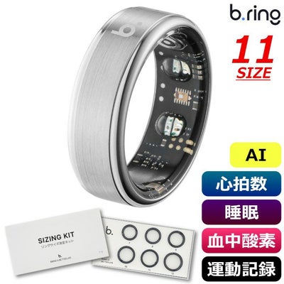 ■セット内容・b.ring ブリング AIスマートリング 11サイズ G2 第二世代 B115SSV2 シルバー・スマートリング サイズ計測キット B03PBKKIT (サイズ合わせ用のb.ring専用サイジングキットです。)■あなたのライフスタイルにフィット。あなたの指先をより美しく完成させます。起きている時も、眠っている時も、一日中身につけても負担にならない快適さで、あなたの日常に自然に溶け込みます。■安心して、気軽に使える(1)90分の充電で、最長7日間持続するバッテリー。充電は短く、仕様は長く。一度の充電で最長7日間つけっぱなしも可能です。※ご利用環境により前後する場合があります。(2)防水・防塵(IP68+5ATM)。日常でも、アウトドアでも。ほこりを寄せつけず、水にも強い。信頼できるタフな設計で、あなたの毎日に安心を。(3)アプリと同期しなくても、最長7日間データを保存。(心拍数のみ3日間)。通常の使用状況においてデータ消失のリスクを軽減できるように、データを自動で保存します。■高精度なバイタルデータ測定(1)光血流センサー、加速度センサーなど精密なセンサーを搭載。小さなリングに搭載された精密なセンサーが、動作からバイタルサインまで指先で繊細に感知します。(2)生体信号をより正確に測定できる部位にフィット。信号を捉えるのに最適な‘‘指‘‘。指にしっかりフィットする事で高精度な計測を実現します。(3)眠りの時間も、パターンも。より細やかなデータであなたの睡眠を解析。細かく計測するパーソナライズド・スリープモニタリング。繊細な睡眠リズムをわかりやすく可視化します。■AIを搭載したb.ring専用スマートアプリ。(1)測る、分析する、管理する。主な健康データをこのひとつで記録・分析。専用アプリで健康データを一目で確認。大切なあなたのデータは全てセキュリティ性の高い国内サーバーでデータを管理しています。(2)かんたんに確認できる自分のコンディション。測定データから導き出されるヘルスレポートは、あなたに合わせて分かりやすく表示されます。(アクティビティ記録、AI食事分析、AIレポート提供、運動時の心拍数計測、ワークアウト記録、運動時の血中酸素測定)(3)操作いらずで簡単計測。特別な操作は不要。設定した時間ごとに自動でバイタルを検知し、必要な時にはリアルタイムでコンディションを確認できます。■b.ringは、つけてるだけで生体情報を分析し毎日の健康をサポートするスマートリングです。日常生活に最適な着け心地とスタイリッシュなデザインが特徴です。■リアルタイムで健康管理・・・ブリング専用アプリで心拍数、睡眠データ、運動データなどさまざまな健康データを一目で確認!いつでもどこでも、簡単に健康状態をチェック、管理できます。ブリングで手軽に健康的な毎日を築きましょう。■主要機能:AI機能(AI健康レポート、カロリーAI)、睡眠測定・分析(睡眠時間、睡眠ステージ、睡眠効率)、活動量測定(歩数、消費カロリー、移動距離)、リアルタイム測定(心拍数、心拍変動、ストレス、血中酸素)、データ共有(家族や友人とリアルタイムで共有)、月経管理(生理周期予測、排卵期予測)、運動記録(ウォーキング、ランニング、サイクリング、水泳、フィットネスなど)、データ連携(Appleヘルスケア、Androidヘルスコネクト)■データ処理は日本国内のサーバーにて行われるため安心■IP68+5ATM防水■スマホと安定的につながるBluetooth5.2使用■約90分の充電で最大7日間使用可能■キズや衝撃にも強いステンレススチール製。肌にも優しく滑らかにフィット。本製品は、一般的な装飾品のリングとはサイズ感が異なります。リングをご購入前に、別売りのサイジングキットをご購入いただき、サイズの採寸をお願いします。(リングご購入後のサイズ違いでの交換・返品は承ることが出来ません。)・心拍数は3日分、それ以外のデータは7日間リングに保存されます。■ステンレススチールは金属アレルギーが出にくい素材になりますが、アレルギー反応は体質等による個人差がありますので、ご自身でご判断のうえご使用下さい。■リングを小さなお子様やペットが飲み込まないようご注意ください。■本製品の測定結果はあくまでも参考用として提供されるものです。医療目的で使用したり、医師の指示の根拠として使用しないでください。また、この測定結果を自己診断や治癒の根拠としないでください。■深海への潜水時など、水中での長時間使用には適しておりません。また、加熱した水に入れないでください。■リングに衝撃を与えたり、破損が発生した場合は防水性能が低下する可能性があります。■ヘアドライヤーなど、熱風でリングを乾かさないでください。■本製品はセラミックを使用している為、硬度の高い物質による衝撃を受けると破損する可能性があります。■充電の際には必ず高温多湿な場所を避けてください。また、充電器や充電ケーブルを濡らさないようご注意ください。■サイズ:リングの寸法/幅8×厚さ2.7m、■重
