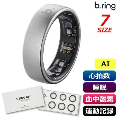 ■セット内容・b.ring ブリング AIスマートリング 7サイズ Pro G1 BP075TNSV1 シルバー・スマートリング サイズ計測キット B03PBKKIT (サイズ合わせ用のb.ring専用サイジングキットです。)■あなたのライフスタイルにフィット。あなたの指先をより美しく完成させます。起きている時も、眠っている時も、一日中身につけても負担にならない快適さで、あなたの日常に自然に溶け込みます。■安心して、気軽に使える(1)90分の充電で、最長7日間持続するバッテリー。充電は短く、仕様は長く。一度の充電で最長7日間つけっぱなしも可能です。※ご利用環境により前後する場合があります。(2)防水・防塵(IP68+5ATM)。日常でも、アウトドアでも。ほこりを寄せつけず、水にも強い。信頼できるタフな設計で、あなたの毎日に安心を。(3)アプリと同期しなくても、最長7日間データを保存。(心拍数のみ3日間)。通常の使用状況においてデータ消失のリスクを軽減できるように、データを自動で保存します。■高精度なバイタルデータ測定(1)光血流センサー、加速度センサーなど精密なセンサーを搭載。小さなリングに搭載された精密なセンサーが、動作からバイタルサインまで指先で繊細に感知します。(2)生体信号をより正確に測定できる部位にフィット。信号を捉えるのに最適な‘‘指‘‘。指にしっかりフィットする事で高精度な計測を実現します。(3)眠りの時間も、パターンも。より細やかなデータであなたの睡眠を解析。細かく計測するパーソナライズド・スリープモニタリング。繊細な睡眠リズムをわかりやすく可視化します。■AIを搭載したb.ring専用スマートアプリ(1)測る、分析する、管理する。主な健康データをこのひとつで記録・分析。専用アプリで健康データを一目で確認。大切なあなたのデータは全てセキュリティ性の高い国内サーバーでデータを管理しています。(2)かんたんに確認できる自分のコンディション。9種類のデータから導き出されるヘルスレポートは、あなたに合わせて分かりやすく表示されます。(アクティビティ記録、AI食事分析、AIレポート提供、運動時の心拍数計測、ワークアウト記録、運動時の血中酸素測定)(3)操作いらずで簡単計測。特別な操作は不要。設定した時間ごとに自動でバイタルを検知し、必要な時にはリアルタイムでコンディションを確認できます。■b.ringは、つけてるだけで生体情報を分析し毎日の健康をサポートするスマートリングです。日常生活に最適な着け心地とスタイリッシュなデザインが特徴です。■リアルタイムで健康管理・・・ブリング専用アプリで心拍数、睡眠データ、運動データなどさまざまな健康データを一目で確認!いつでもどこでも、簡単に健康状態をチェック、管理できます。ブリングで手軽に健康的な毎日を築きましょう。■主要機能:AI機能(AI健康レポート、カロリーAI)、睡眠測定・分析(睡眠時間、睡眠ステージ、睡眠効率)、活動量測定(歩数、消費カロリー、移動距離)、リアルタイム測定(心拍数、心拍変動、ストレス、血中酸素、皮膚温度)、データ共有(家族や友人とリアルタイムで共有)、月経管理(生理周期予測、排卵期予測)、運動記録(ウォーキング、ランニング、サイクリング、水泳、フィットネスなど)、データ連携(Appleヘルスケア、Androidヘルスコネクト)■データ処理は日本国内のサーバーにて行われるため安心■IP68+5ATM防水■スマホと安定的につながるBluetooth5.2使用■約90分の充電で最大7日間使用可能■軽量で耐久性に優れたプレミアムチタン素材を採用しています。腐食に強く肌にもやさしいため、長時間着用しても快適に過ごせます。■日常使いからアウトドアまで、幅広くご使用頂ける実用性の高いアイテムです。■本製品は、一般的な装飾品のリングとはサイズ感が異なります。リングをご購入前に、別売りのサイジングキットをご購入いただき、サイズの採寸をお願いします。(リングご購入後のサイズ違いでの交換・返品は承ることが出来ません。)■心拍数は3日分、それ以外のデータは7日間リングに保存されます。■リングを小さなお子様やペットが飲み込まないようご注意ください。■本製品の測定結果はあくまでも参考用として提供されるものです。医療目的で使用したり、医師の指示の根拠として使用しないでください。また、この測定結果を自己診断や治癒の根拠としないでください。■深海への潜水時など、水中での長時間使用には適しておりません。また、加熱した水に入れないでください。■リングに衝撃を与えたり、破損が発生した場合は防水性能が低下する可能性があります。■ヘアドライヤーなど、熱風でリングを乾かさないでください。■本製品はセラミックを使用している為、硬度の高い物質による衝撃を受けると破損する可能性があります。■充電の際には必ず高温多湿な場所を避けてください。また、充電器や充電ケーブルを濡らさないようご注意ください。■サイズ:リングの寸法/幅7×厚さ2.55m、■重量:2.9~3.6g(サイ