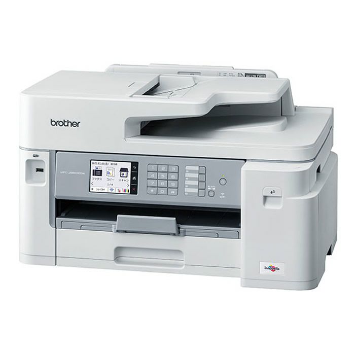 ◎大容量インクカートリッジ対応で低ランニングコストを実現。 A3プリント、A4読み取りのコンパクト複合機。■基本機能・A3 カラープリント・A4→A3 拡大カラーコピー・A4 カラーファクス・A4 カラースキャン・ネットワーク・PCファクスA4送信/A3受信・ダイレクトプリント■大容量インクカートリッジ カラー約5,000枚、ブラック約6,000枚の大容量インクカートリッジに対応。 インク交換の手間を大幅に軽減します。■低ランニングコスト カラー約4.1円(税込)/枚、モノクロ約0.8円(税込)/枚の低ランニングコストを実現。 プリント量の多いオフィスのコストカットに貢献します。■高耐久 インクジェットで約30万ページの高耐久を実現。廃インクパッドの交換も必要ありません。※1■高速プリント 1分間にA4カラー約30ページ、A4モノクロ約30ページという高速印刷を実現。 オフィスの作業効率アップに貢献します。※1 解像度:普通、環境:常温常湿、片面印刷時、印字パターン:ISO/IEC 24734。メーカー内環境においての計測結果に基づきます。廃インクパッドについては、月間使用枚数1,000枚~5,000枚時の計測結果に基づきます。環境によっては30万ページより前に、廃インクパッドの交換が必要になる場合もあります。≪本体仕様≫■製品名:MFC-J5800CDW■JANコード:4977766814348■形式:デスクトップタイプ■読み取り方式:CIS■サポート原稿サイズ ADF使用時幅:105~215.9mm ADF使用時長さ:148~355.6mm( 長尺原稿機能使用時は最大900mm) 原稿台ガラス使用時幅:最大215.9mm 原稿台ガラス使用時長さ:最大297mm■原稿読み取り幅:最大213.9mm(ADF、原稿台ガラス)■原稿読み取り長さ:最大353.6mm(ADF)、最大295mm(原稿台ガラス)■記録方式:カラーインクジェット■最小液滴量:カラー: 2.5pl、ブラック: 4pl■インクカートリッジ:4色顔料独立カートリッジ方式■対応OS*1*2 Windows 11、10、8.1、7 SP1 Windows Server 2022、2019、2016、2012/2012 R2、2008/2008 R2 macOS v 10.15.X~*3 Chrome OS*4■メモリー容量:256MB■電源:AC 100V 50/60Hz■消費電力*5 スリープ時:約0.9W、レディー時:約5.5W コピー時※6:約35W■動作環境:温度10-35℃、湿度20-80%(結露無き事)■稼動音*7:約51.5dBA■外形寸法(横幅×奥行き×高さ):545×436×305mm(突起部を除く)*8■質量(消耗品含む):約17.7kg■付属品:スターターインクカートリッジ、取扱説明書、CD-ROM、電話機コード、A4用紙(普通紙)、紙詰まり解消シート、ローラークリーニングキット、保証書他印刷物■製品寿命:約30万ページまたは7年間のずれか早い方*14■ADF枚数*9:最大50枚■給紙枚数*9 [トレイ1] 最大250枚 [多目的トレイ](背面) 最大100枚(A3まで)、最大50枚(はがき)*10■最大給紙枚数/最大排紙枚数*9:350枚/100枚■インターフェイス [Hi-Speed USB 2.0*11] 有り [有線LAN*12] 有り(10Base-T/100Base-TX) [無線LAN*12] 有り(IEEE802.11a/b/g/n)■エコモード:有り■クロだけ印刷*13:有り■液晶サイズ/タッチパネル:3.5型TFT/有り■セキュリテ機能ロック:有り■原稿取り忘れ防止機能:有り*1 最新OSの対応状況につきましては、ブラザーサポートサイトをご覧ください。*2 Windows Server OSはネットワークプリントのみ対応となります。*3 macOS対応ドライバーは提供がありません。Macから印刷またはスキャンを行う場合は、AirPrintをご利用ください。*4 Chrome OSでは、OS標準の印刷機能とスキャン機能に対応しています。機能制限についての最新情報はブラザーサポートサイトをご覧ください。*5 USB接続時の数値です。*6 画質:標準、原稿:ISO/IEC24712印刷パターン、ADF片面印刷時*7 音圧レベルの数値となります。*8 多目的トレイを含む高さは397mmです。*9 坪量80g/m2普通紙使用時。*10 坪量220g/m2普通紙はがき/インクジェット紙はがき使用時。*11 USBについては、各対応OSのプレインストールモデルに対応。また、各対応OSのプレインストールモデルからのアップグレード環境にも対応しています。Hi-Speed USB2.0でのご使用は、パソコン側がHi-Speed USB2.0を標準装備している必要があります。また、Hi-Speed USB2.0インターフェイスはUSB1.1の完全上位互換ですので、パソコン側のインターフェイスがHi-Speed USB2.0に未対応でも従来のUSB1.1での転送速度にて動作可能です。*12 有線/無線ネットワークの両方に対応している製品は、接続は排他的(有線/無線のどちらか一方)になります。対応認証方式は、オープンシステム認証、共有キー認証、WPA-PSK/W-PA2-PSKです。対応暗号方式はWEP(64/128ビット)/TKIP/AESです。WPSを使う場合は、アクセスポイントが対応している必要があります。*13 用紙の設定によっては「クロだけ印刷」ができない場合があります。電源コードを抜いたり、空になったインクカートリッジを取り外したりした場合は、新しいインクカートリッジを取り付けるまで印刷できません。*14 廃インクパッドの交換不要。解像度:普通、環境:常温常湿、片面印刷時、印字パターン:ISO/IEC 24734。メーカー内環境においての計測結果に基づきます。廃インクパッドについては、月間使用枚数1,000枚~5,000枚時の計測結果に基づきます。環境によっては30万ページより前に、廃インクパッドの交換