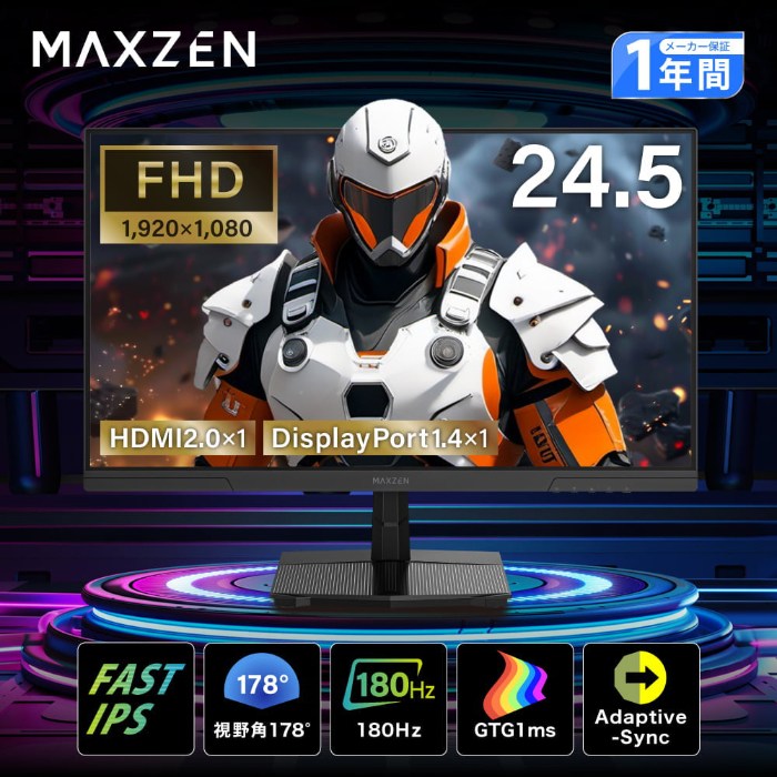 ■応答速度1ms(GTG)リフレッシュレート最大180Hz180Hzの高リフレッシュレート、応答速度1ms(GTG)で、残像感や表示遅延を抑止し、さらに滑らかな映像を楽しむことができます。■クリアな画質のFHD1920×1080の高画質でリアルな色彩を美しいまま映し出します。■より高速な応答速度を実現従来のIPSの広い視野角を保ちつつ、より高速な応答速度の実現。見る角度による明度や色の変化を軽減し、高透過率で画質をコントロール。■Adaptive-Sync対応画面のカクツキや遅延を抑え、より没入感のあるプレイができます。■画面のチラつきを抑えるフリッカーフリー機能目の負担の原因となるフリッカーを抑え、長時間の使用にもおすすめです。■反射の少ない快適設計ノンアングレア(非光沢)モニターは反射や映り込みが少なくゲームにより集中しプレイすることができます。■目にやさしいブルーライトカット目の疲れの原因になるブルーライトの量を軽減。長時間の使用でも快適に使用することができます。■豊富な10個のゲーム設定各シーンや映像によって最適なモードを設定することができます■カウントダウン表示機能オンとオフの時間、表示位置を設定することができ、ゲームのプレイ時間がすぐにわかります。■97%sRGBと1670万色で鮮やかな美しい画質97%sRGBと1670万色でより一層こまやかな色合いの表示を実現し鮮やかで美しい映像を楽しむことができます。■見やすい角度に高さや角度を調節可能画面を前後に傾けて見やすい角度に調節できます。■壁掛けやアームの取り付けが可能!VESAマウント対応のため、市販の「壁掛け用金具」を使用して壁に取り付けができます。■液晶パネル・画面サイズ:24.5インチ・バックライト:LED・駆動方法:FAST IPS・画素数:1920(H) × 1080(V)・応答速度:1ms(GtoG)・視野角:左右約 178° / 上下約 178°・輝度:標準 : 300cd/m2 最小 : 250cd/m2・コントラスト比:1000 : 1・画素ピッチ:0.0944(H) × 0.2802(V)mm・表面処理:非光沢・表示色:1670万色・色空間:sRGB : 97% DCI-P3 : 86%・リフレッシュレート(最大):180Hz・フリッカーフリー機能:〇■機能:Adaptive-sync、DCR、フリッカーフリー機能(ちらつき軽減)、ローブルーモード(ブルーライト軽減)、MPRT、各種ゲーム設定、ピクチャー設定、色設定、ナイトビジョンモード、Game+機能、(ゲームアシスタント、ダイナミックOD)、省エネ設定など■入力端子:HDMI 2.0×1、DisplayPort1.4×1■ヘッドホン端子:× 1■電源:ACアダプター / 入力 : AC100-240V 50/60Hz 1.0A MAX / 出力:DC 12V 3.0A■消費電力:最大≦42W 通常≦27W 待機時≦0.5W■使用環境:温度5~35℃ 湿度80%以下■保管環境:温度-15~45℃ 湿度90%以下■サイズ・スタンド含まず:W557.7 × H330.6 × D58.1mm・スタンド含む:W557.7 × H422.6 × D218.5mm■重量・スタンド含まず:2.9kg・スタンド含む:3.2kg■モニター可動範囲:チルト:-5°~20° ±2°■VESAマウント:100×100mm■付属品:スタンドアーム(ケーブルタイ付)×1、スタンドベース×1、ACアダプター×1個、取扱説明書×1部、DisplayPortケーブル×1