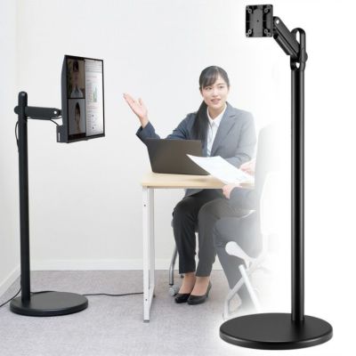 ■タテ・ヨコ90度に回転可能モニター画面の向きをタテ・ヨコ90度ずつ回転できるので、モニターを付け替えることなく用途・使用場所に合わせて簡単に向きを変えることが可能です。ヨコは会議室や打ち合わせなどのビジネスシーンで、タテは展示会やセミナー会場などでデジタルサイネージとして活用できます。■底床キャスター付きで移動が簡単台座にキャスターが付いているので設置したい場所へスムーズに移動できます。低床キャスターを採用しているため重心が低く安定感があり、キャスターが台座の中に隠れているので、外観もスタイリッシュです。■外形寸法:約Φ406x1,178(H)mm■質量:約13.3kg■主な材質:スチール、アルミニウム、プラスチック■セット内容:本体、組み立て用ネジ×5、モニター取り付け用ネジ×8、モニター取り付け用ワッシャー×4、レンチ×3、取扱説明書(保証書付)■対応規格:VESA規格 100mm/75mm■対応モニター:17~32インチ/2~10kg■可動範囲:モニター傾斜 上80°/下90°※アーム水平時 モニター回転 ±90°