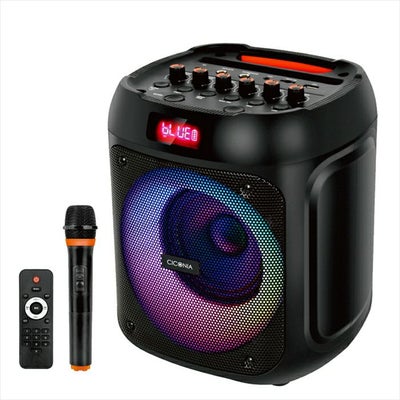 ○Bluetooth接続スマートフォンやパソコン等と無線で接続し、ワイヤレスで気軽に音楽を楽しめます!○入力端子も充実しています!・microSDカード、USBメモリー・ギター入力、マイク入力、AUX入力端子○カラフルなLEDイルミネーション効果的な光の演出で、雰囲気に合わせて音楽を目で楽しむことができ、様々なイベントやパーティーの場面で大活躍!○小さいけれど最大出力80w○持ちてあり○TWSシステム同モデルの2台のスピーカー間でワイヤレス接続を行う機能です。TWS接続により、2台のスピーカーが自動的にグループ化され、左右のチャンネル出力するステレオスピーカーシステムになります。○付属品・ワイヤレスマイク×1(電池別売り:単3乾電池×2本)・リモコン×1(電池別売り:単4乾電池×2)・ACアダプター×1・取扱説明書×1○FMラジオも聞けます♪周波数帯:76-108MHz○内蔵バッテリー 2200mAhバッテリーが内蔵されているので、充電しておけば、屋外でも使用可能!・充電時間:約6時間連続使用時間:約2.5~3.5時間※使用環境によります○コントロールパネル【仕様】・最大出力:80W・インピーダンス:4Ω・センシティビティ:82±3dB・周波数特性:70Hz~18KHz・S/N比:70dB・ウーファー:5インチ・ツイーター:1インチ・Bluetoothバージョン:5.0・ワイヤレスマイク周波数:261.8MHz・FMラジオ周波数帯:76-108MHz・電源:DC9V 1.5A・バッテリー:7.4V 2200mAh・充電時間:約6時間(※使用環境による)・連続使用時間:約2.5~3.5時間(※使用環境による)・再生可能ファイル形式:MP3/WAY・USBメモリー/microSDカードの対応容量:128Gまで・本体サイズ:約 D232×W242×H280 mm・本体重量:約 2.6kg・付属品:ワイヤレスマイク×1(電池別売り:単3乾電池×2本)、リモコン×1(電池別売り:単4乾電池×2)、ACアダプター×1、取扱説明書×1
