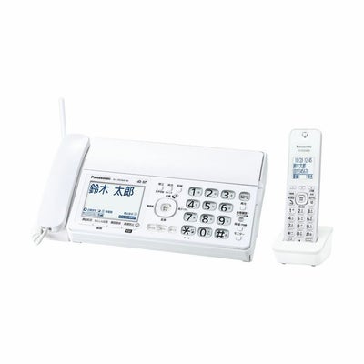○着信音が鳴る前に相手に警告メッセージを流す「迷惑防止」機能搭載。○光って分かりやすい「着信お知らせLED」を子機に搭載。○ナンバー・ディスプレイ契約なしでも不在着信履歴を表示(日付・時刻のみ)。○外形寸法(高さ×幅×奥行)・親機:約86×296×191mm(受話器、突起部除く)/約256×296×240mm(記録紙トレーオープン時、受話器、突起部除く)・子機:約175×49×25mm・充電台:約47×73×90mm○質量・親機:約2.4kg(お試し用インクフィルム5m装着時)・子機:約140g(電池パック含む)○充電台:約155g○付属品:受話器,受話器コード,お試し用インクフィルム(約5m),コードレス子機,子機用電池パック,子機用電池カバー,子機充電台