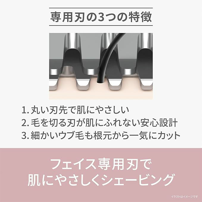 ■丸い刃先で肌にやさしい、約0.12mmのうす刃。水なしですっきり剃れる。