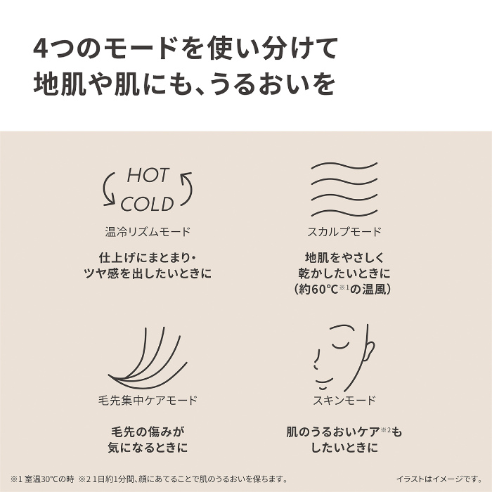 ■搭載モード:温冷リズムモード / スカルプ(地肌)モード / スキンモード / 毛先集中ケアモード