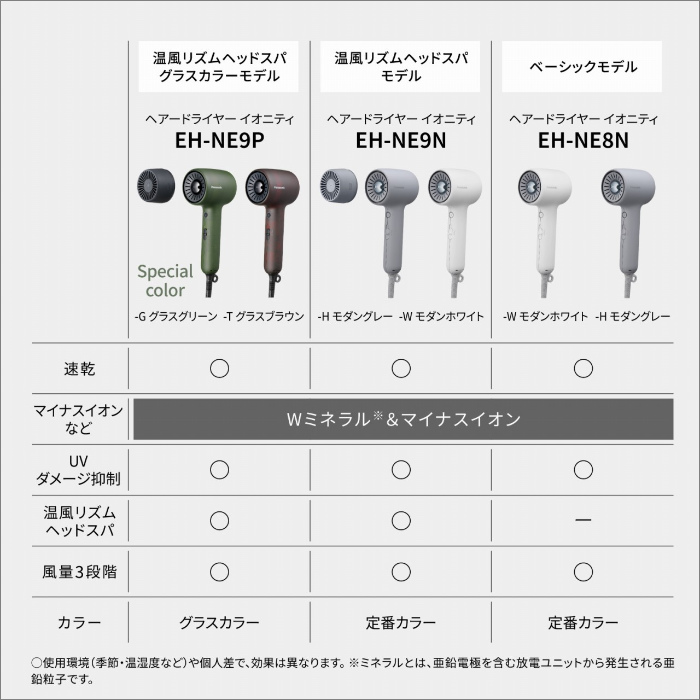 ◎迷いも吹き飛ぶ、驚きの速乾。乾かすだけじゃない、 UVダメージ抑制まで。 小型・高回転モーターにより、 軽量※1なのに、圧巻の速乾性を実現。さらに、Wミネラル ※2&マイナスイオンにより UVダメージを抑制しながら、 指通りのよいさらさら髪へ。毎日のヘアドライで、手軽にヘアケアを。■パワフルな風で、速乾性能 約1.2倍※3* パナソニック測定法による毛束の乾燥試験機による評価 小型・高回転モーターで高圧・高速の風をつくり出すことで、圧巻の速乾性を実現。パワフルなのに絡まりにくい風設計(特許出願中)で、速く美しく乾かします。■小型・高回転のモーターを採用し、従来よりもコンパクトな送風ブロックを実現■約17%軽量化※4、体積比約46%減※5 使いやすさを求めたコンパクト設計■Wミネラル※2&マイナスイオンで乾かすだけでUVダメージ抑制 年中浴びる紫外線は、お肌だけでなく髪にとっても大きなダメージの原因となります。毎日のヘアドライでUV・摩擦ダメージまで抑制して、指通りのよいさらさら髪へ。■こだわりのデザイン、質感■使いやすいボタンや、スイッチ 風温は4段階、風量は3段階で切り替え可能。速乾もスタイリングもこれ1台。※1 メーカー2024年発売EH-NE7MとEH-NE8Nとの比較(メーカー調べ)※2 ミネラルとは、亜鉛電極を含む放電ユニットから発生される亜鉛粒子です。※3 メーカー2024年発売EH-NE7M(TURBO時)とEH-NE8N(強風・HOT時)との比較(メーカー調べ)※4 メーカー2024年発売EH-NE7M(約550g)とEH-NE8N(約455g)とのコードを含む質量比較(メーカー調べ)※5 メーカー2024年発売EH-NE7MとEH-NE8Nとのブッシング以降のコードを含まない体積比較(メーカー調べ)■電源方式:交流式■温風温度:約80℃(強風/HOT・室温30℃時)■風量:0.8m3/分(強風時)■電源コード長さ:約1.7m■本体寸法:高さ21.1×幅9.5×奥行7.5cm■質量:約455g■機能 ミネラル★1 マイナスイオン■搭載モード HOT WARM COLD 温冷リズム■電源:AC100V 50-60Hz■消費電力:約1200W(強風/温冷リズム時)【安全に関するご注意】●ご使用の際は、定格15A以上のコンセントを単独でご使用ください(消費電力1000W以上の為) ⇒単独で使用しないと火災や感電の原因となります。★1 ミネラルとは、亜鉛電極を含む放電ユニットから発生される亜鉛粒子です。