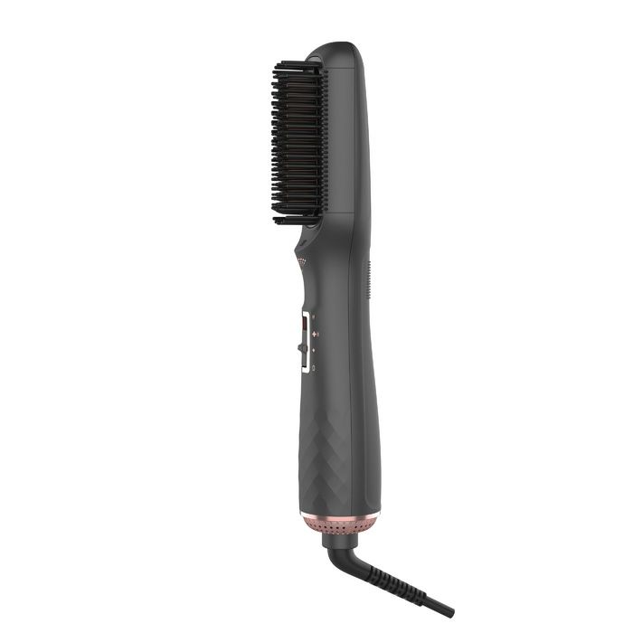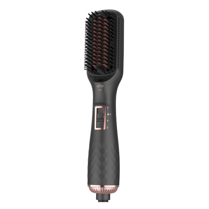 ■遠赤外線+マイナスイオン発生 ブラシ型ヘアアイロン&ドライヤー 4way仕様■遠赤外線&マイナスイオンでツヤツヤさらさらな仕上がり。1本で4つの役割、ドライヤー+ストレートアイロン+カールアイロン+ヘアブラシ。遠赤外線・マイナスイオンも搭載。遠赤外線が髪内部の水分を維持して外側の水分のみ乾燥を促進し、髪の奥深くから髪を乾燥させ熱風ブラシよりも最大50%はやく髪を乾かします。マイナスイオンが髪を整え、滑らかにし、より輝かせます。髪のボリュームアップ・カール・ストレートブローにも簡単使用。■遠赤外線■マイナスイオン■温度調整2段階:Low : 190℃・High : MAX220℃■風量調整2段階:1.9m / 秒・2.7m / 秒■本体サイズ:H63×W290×D57(mm)■重量:474g(コード込)■電源:交流式■入力電源:AC100V 50-60Hz■消費電力:480W■材質:本体:PC(ポリカーボネート)・ヒーター:PA(ポリアミド)、PTC■特記:保証期間:1年■付属品:取扱説明書(保証書付)※備考:DCモーター