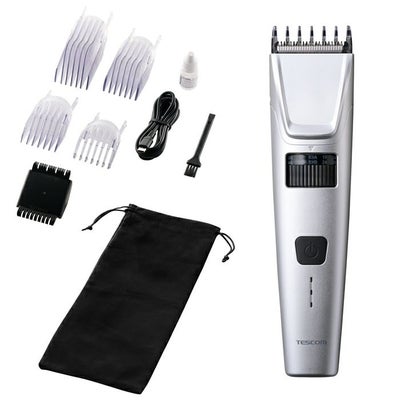 ショートスタイルならこれ1台で完結。1mm単位の長さ調節と5種類のアタッチメントで自由なスタイルチェンジを実現するヘアカッターです。防水設計で濡れ髪のカットも可能。USB Type-C 充電式で、切りたいその日にすぐに充電、パパっとカット。場所を選ばずホームカットを楽しめます。■ボウズからミディアムショートに対応 幅広いヘアスタイルに対応。ボウズやミディアムショート、前髪のちょこっとカットにも使えます。■刈り高さ幅3mm~52mmに対応 手元のダイヤルを回すだけで1mmずつ長さ調節が可能。選べる4種類のアタッチメントと組み合わせて、刈り高さ幅3mm~52mmに対応。セルフカットでも手軽に理想の髪型を実現できます。■スキ刈りコーム スキ刈りコームを使えば、耳まわりなどの生え際もスキバサミのような自然な仕上がりに。ボリュームダウンも簡単です。■45度の鋭角刃でスムーズにカット 切れ味の良い45度の鋭角刃を採用。髪が引っかかりにくく、スムーズな刈り心地ですばやくセルフカットできます。■握りやすく軽量なボディ 握りやすさを考慮したボディ形状と軽量設計で、疲れにくくラクに使えます。■流水にも強い防水設計 流水にも強いIPX7の防水設計。濡れた髪のままでも使えるので、入浴のついでにヘアカットを済ませたいときにもぴったりです。※シャンプーの泡を落としてからお使いください。※お風呂場など水気のある場所では、電源アダプターを接続してのご使用はおやめください。(交流時)■刃を外さずサラっと水洗い 刃先を本体にセットしたまま水洗いでき、本体についた毛クズもきれいに流せます。※故障の原因になりますので、水の中に入れて洗わないでください。■掃除用ブラシ付属 専用の掃除用ブラシを付属。しっかりカットの後は、刃を外して内側から毛クズを取り除くことができます。■1回の充電で60分間の連続使用可能 1回の充電で60分間の連続使用が可能なロングバッテリーモデル。もし途中で充電が切れても、USB Type-C ケーブルで充電しながら使えます。家族で順番に使う際も安心です。※使用時間 最大20分×3回の計60分■急速2時間充電 本体への充電時間を50%短縮。急速2時間充電で、切りたいその日にすぐ充電してパパっとカットできます。※従来機種TT590Aとの比較※本製品に電源アダプターは付属しておりません。USB Type-Cポート搭載のものを別途ご用意ください。■電池残量がわかるLEDランプ 充電状況がわかるLEDランプで、電池残量を把握しながら使えます。突然のバッテリー切れの心配がありません。■海外使用OK AC100-240Vの地域で使用できます。 A2プラグ地域以外でご使用の際は、変換プラグをご用意ください。■本体寸法:幅約45mm×奥行約39mm×高さ約184mm■本体質量:175g■消費電力:5W以下■付属品:コーム4種(刈り高さ3mm-11mm/16mm-24mm/30mm-38mm/44mm-52mm)、スキ刈りコーム、電源ケーブル(USB Type-C(TM) - USB Type-C)、掃除用ブラシ、TESCOMオイル、収納ポーチ■電源:入力:AC100-240V 50/60Hz、出力:DC5.0V 1.0A■充電時間:2時間■水洗い:◯■海外使用:◯■コード長:1.8m■型番/JANコード:-S(シルバー):4975302559029■電源方式:充電・交流式■使用時間:60分■使用電池:リチウムイオン電池■刃幅:40mm■刈り高さ:0.8mm■スイッチ:ボタン式■充電残量表示:LEDランプ3段階■主材料:ABS■防水性能:IPX7(本体)■パーツ:コームA(TA034328)、コームB(TA034335)、コームC(TA034342)、コームD(TA034359)、スキ刈りコーム(TA034366)、電源ケーブル(TA034397)、替え刃(TA034380)、オイル(500150)、掃除ブラシ(501455)■保証期間:1年間
