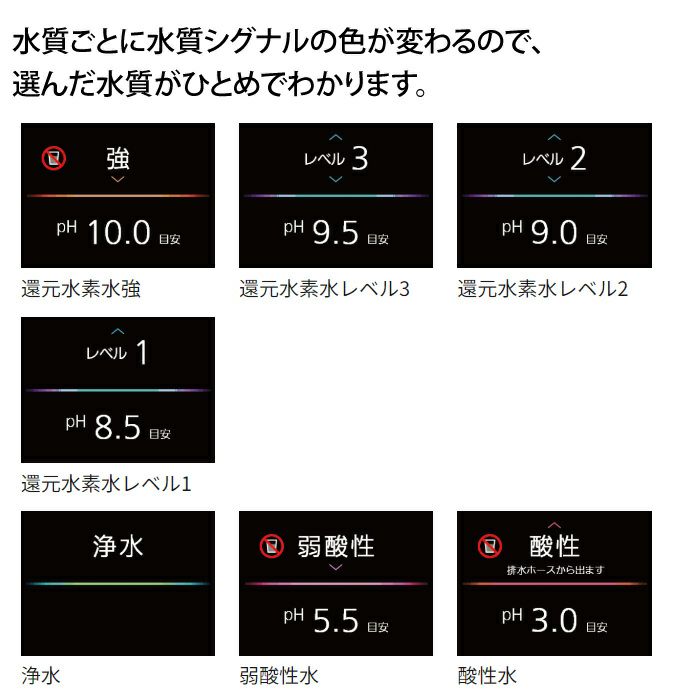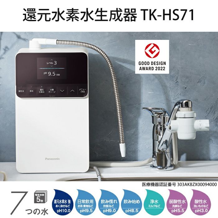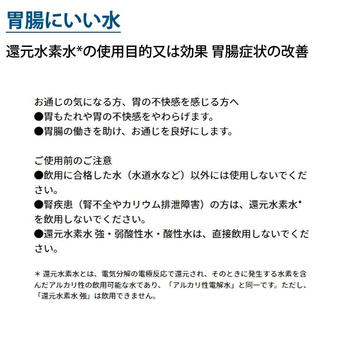 ■基本性能にこだわったスタンダードタイプ■生成中の水の情報がひとめでわかる大型カラー液晶。■pHや選んだ水質のほか、通期中は気になる水素濃度もわかりやすく表示。■奥行10cmあれば設置できる省スペース設計。■水栓横にも置きやすいコンパクトなデザイン。■1Lあたり2円以下※1の低ランニングコスト。■カートリッジ交換目安は約2年※2。家族でたっぷり飲める。※1 カートリッジ代・水道代・電気代含む、カルシウム添加不要、本体代金を除く。※2 1日15L使用時。■生成水質:7つの水■水質シグナル:○(フルカラー液晶)■水素チャージ:○(2段階)■電極(電極枚数):○(5枚)■水切換レバー:〇原水泡沫ストレート、原水泡沫シャワー■アルカリイオン・酸性イオン:○■液晶表示:○(フルカラー)■水素レベル表示:○(水素濃度目安表示)■アルカリ強機能・強酸性機能:○■排水カット(浄水モード時):○■つづくモード:○(自動)■類別:機械器具83 医療用物質生成器■一般的名称:連続式電解水生成器(JMDNコード71024000)■医療機器の種類:管理医療機器■医療機器認証番号:303AKBZX00094000■定格:交流100V 2.8A 50-60Hz■消費電力:約240W(待機時:約0.9W)■本体・寸法:高さ32.8×幅18.0×奥行11.5cm(液晶部を含む奥行き123mm)・質量(満水時):約4.4kg(約4.9kg)■給水仕様・接続:水切換レバーによる接続(3段切換式)■本体使用水温:35℃未満(水切換レバーは80℃未満)■本体使用可能水圧(動水圧):70kPa~350kPa■使用可能配水管圧力(静水圧):70kPa~750kPa■電解・電解方式:連続電解方式・吐水量(生成水流量):還元水素水:2.3L/分[水圧100kPaのとき](「標準」モードのとき) / 弱酸性水:2.0L/分[水圧100kPaのとき]・排水比率の目安(100 kPa時):16:1※1(標準モード、還元水素水レベル1~3時)・電解能力切換:還元水素水:4段階 酸性:2段階・連続使用可能時間:常温時約10分間※2・電極材質:白金(属)コーティングチタン・電解槽使用限界時間の目安:累積約850時間(イオン水生成時間・洗浄時間のみ)・電解洗浄:オートクリーニング方式■浄水吐水量:2.5L/分(水圧100kPaの時)■ろ過流量:2.5L/分(水圧100kPaの時)■除去対象物質・遊離残留塩素(カルキ)※3:12000L・濁り※4:12000L・クロロホルム※5:12000L・総トリハロメタン※5:12000L・ブロモジクロロメタン※5:12000L・ジブロモクロロメタン※5:12000L・ブロモホルム※5:12000L・テトラクロロエチレン※5:12000L・トリクロロエチレン※5:12000L・CAT(農薬)※3:12000L・2-MIB(カビ臭)※3:12000L・溶解性鉛※3:12000L・1,2-DCE※5:12000L・ベンゼン※5:12000L・ジェオスミン※3:12000L・フェノール類※3:12000L・PFOSおよびPFOA※6:12000L・鉄(微粒子状)※7:●・アルミニウム(中性)※7:●■ろ材(カートリッジ)の取替(交換)時期の目安※8:約2年間(1日15L使用時)■ろ材の種類:不織布、活性炭、セラミック、中空糸膜■電源コードの長さ:約2m■ホースの長さ:給水ホース約0.9m / 排水ホース約0.6m■付属品:浄水カートリッジ1個、水切換レバー、固定具セット、吸盤、吐水パイプ、ホース固定バンド、pH試験液※1 水素チャージ、弱酸性水、還元水素水強を使用の際は、5:1になります。※2 水質・使用環境によって短くなることがあります。※3 JIS S 3201試験による除去率80%の値※4 JIS S 3201試験によるろ過流量の50%の値※5 JIS S 3201付属書A試験結果による除去率80%の値※6 浄水器協会(JWPA)で定められた規格基準(JWPAS B基準)による除去率80%の値※7 浄水器協会(JWPA)で定められた規格基準(JWPAS B基準)による除去率80%の物質。 なお、浄水能力を規定しているものではありません。※8 使用水量・水質・水圧によって大幅に短くなることがあります。広告文責:株式会社ピーシーあきんどTEL:03-3835-1383メーカー(製造):パナソニック株式会社区分:医療機器