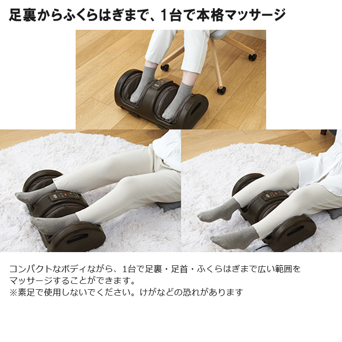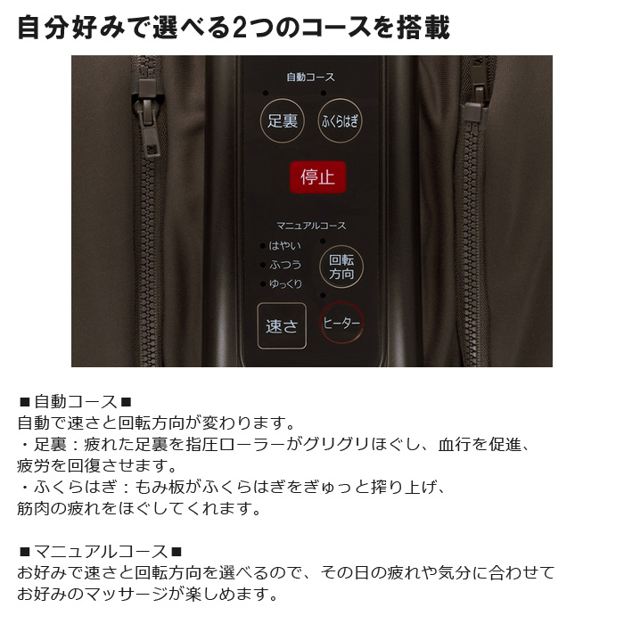 ■もみ板と指圧ローラーで疲れた足をしっかりもみほぐす■足裏からふくらはぎまで、1台で本格マッサージ■両側のもみ板と足裏の指圧ローラーでコリをしっかりもみほぐす■自分好みで選べる2つのコースを搭載。自動コース(足裏/ふくらはぎ)・・・自動で速さと回転方向が変わり、それぞれの部位に適した強さとリズムで刺激します。マニュアルコース・・・3段階の速さとお好みの回転方向を手動で設定できます。■足先を温めながらマッサージするヒーター機能※温熱治癒効果はありません。素足で利用しないでください。■取り外して洗えるカバーでいつでも清潔■本体サイズ:幅約499×奥行約305×高さ約224mm■本体重量:約5.5kg■電源:AC100V 50/60Hz■消費電力:40W■医療機器認証番号:303AKBZX00044A01■コードの長さ:約1.8m■安全上のご注意〇次の人は使用しない。・医師からマッサージを禁じられている人例:血栓[そく(塞)栓]症、重度の動脈りゅう(瘤)、急性静脈りゅう(瘤)、各種皮膚炎、皮膚感染症(皮下組織の炎症を含む)など〇次の人は、使用前に医師に相談の上、ご使用ください。・ペースメーカーなどの電磁障害の影響を受けやすい体内植込み型医用電気機器を使用している人・悪性しゅよう(腫瘍)のある人・心臓に障害のある人・温度感覚喪失が認められる人・妊娠中または出産直後の人・糖尿病などによる高度な末しょう(梢)循環障害からくる知覚障害のある人・けんしょう(腱鞘)炎の人・皮膚に創傷のある人・安静を必要とする人・体温38°C以上(有熱期)の人・急性炎症症状[けん(巻)怠感、悪寒、血圧変動など]の強い時期や衰弱しているとき・骨粗しょう(鬆)症の人、せきつい(脊椎)の骨折、ねんざ(捻挫)、肉離れなどの急性[とう(疼)痛性]疾患の人・かつて治療を受けたところ、または疾患部へ使用する人・医師の治療を受けている人・上記以外に特に身体に異常を感じている人事故・体調不良・けがの恐れがあります。