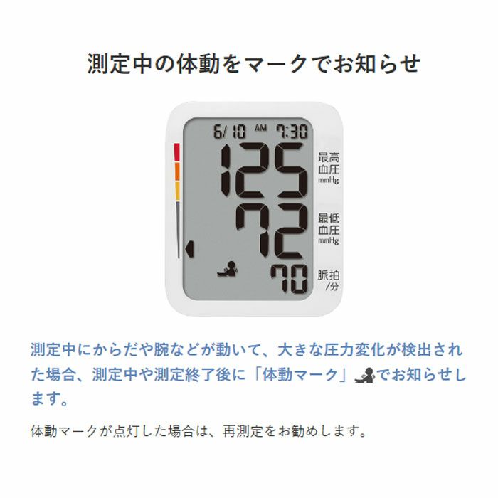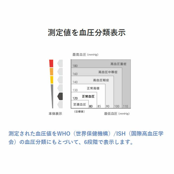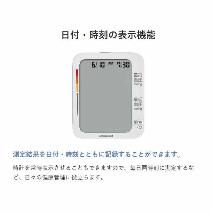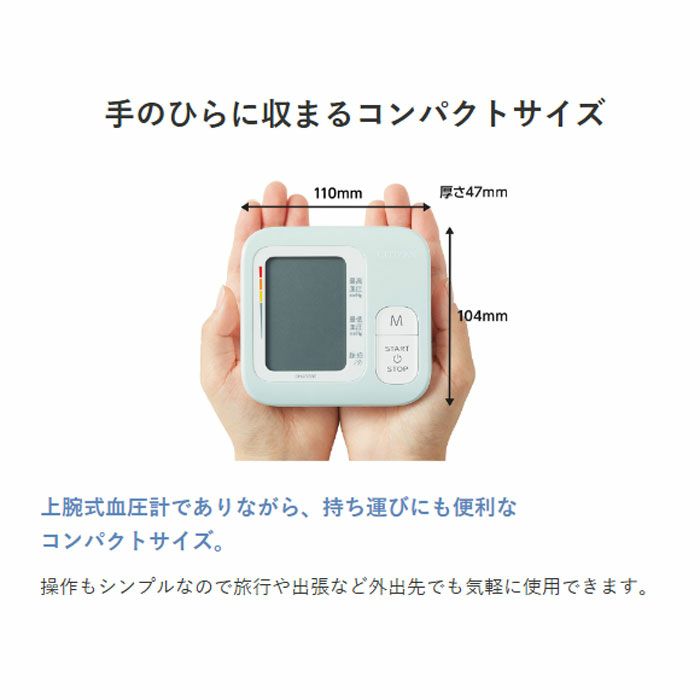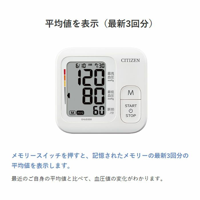 ■上腕式血圧計でありながら、持ち運びにも便利なコンパクトサイズ。操作もシンプルなので旅行や出張など外出先でも気軽に使用できます。■測定結果を日付・時刻とともに記録することができます。時計を常時表示させることもできますので、毎日同時刻に測定するなど、日々の健康管理に役立ちます。■カフの使いかたカフの青い帯を腕の内側に合わせて巻き、測定します。適用腕周範囲は22~32cmです。■メモリースイッチを押すと、記憶されたメモリーの最新3回分の平均値を表示します。最近のご自身の平均値と比べて、血圧値の変化がわかります。■不規則な脈間隔をマークでお知らせ測定中の脈の間隔が不規則な場合、測定終了後に「脈間隔変動マーク」でお知らせします。脈間隔変動マークが点灯した場合は、再測定をお勧めします。■測定中にからだや腕などが動いて、大きな圧力変化が検出された場合、測定中や測定終了後に「体動マーク」お知らせします。体動マークが点灯した場合は、再測定をお勧めします。■測定値を血圧分類表示測定された血圧値をWHO(世界保健機構)/ISH(国際高血圧学会)の血圧分類にもとづいて、6段階で表示します。■ニッケル水素充電池に対応繰り返し使えるニッケル水素充電池(別売り)に対応し、環境に配慮しました。※パナソニック製ニッケル水素充電池エネループまたは、充電式エボルタ対応(別売り)■測定方式:オシロメトリック法■測定部位:左腕(右上腕も可)■カフ(適用腕周範囲):ソフトカフ(範囲:22.0~32.0cm)■表示方式:デジタル表示■測定範囲:圧力:0~280mmHg、目量:1mmHg、脈拍:40~180拍/分■測定精度:圧力:±3mmHg、脈拍:読み取り数値の±5%■加圧:ポンプによる自動加圧■減圧:微速排気弁方式■排気:電磁弁による自動排気■定格及び電源:DC6V、単4形乾電池4本、または専用ACアダプター(別売りAC-230CZ-J1)、 / または単4形ニッケル水素充電池(エネループまたは充電式エボルタ)4本■電池寿命:アルカリ乾電池:約300回、マンガン乾電池:約150回 / ※モニター用電池をのぞく(1日1回測定、室温22℃、170mmHg加圧で測定の場合)■メモリー:60回分■質量:本体:約210g(電池含まず)、カフ(腕帯):約130g■寸法:約110(幅)×47(高さ)×104(奥行)mm■使用温湿度:10~40℃、相対湿度15~85%RH■保管温湿度:-20~60℃、相対湿度10~95%RH■付属品:カフ(腕帯)、単4形アルカリ乾電池4本(モニター用)、取扱説明書/保証書、医療機器添付文書、EMC技術資料■販売名:シチズン上腕式血圧計CHUGシリーズ■医療機器認証番号:231ADBZX00029000広告文責:株式会社ピーシーあきんどTEL:03-3835-1383メーカー(製造):シチズン区分:医療機器