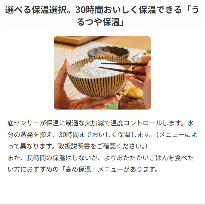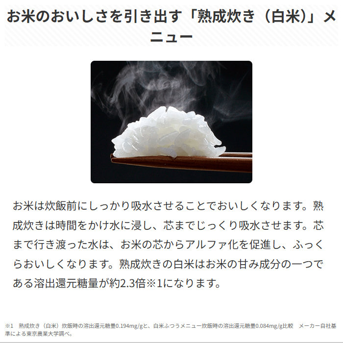 ■炊飯容量(白米L):0.09~0.54(0.5合~3合)■電源 : 交流100V 50/60Hz■消費電力 : 700W■炊飯方式 : IH方式■コードの長さ : 1.0m(コードリールつき)■外形寸法(約cm) : 幅23×奥行30×高さ19(36※1)■質量 : 約3.2kg■最大炊飯容量 : 0.54L■区分名 : A■蒸発水量 : 28.6g■年間消費電力量 : 50.3kWh/年■1回当たりの炊飯時消費電力量 : 115Wh■1時間当たりの保温時消費電力量 : 14.7Wh■1時間当たりのタイマー予約時消費電力量 : 1.04Wh■1時間当たりの待機時消費電力量 : 0.95Wh