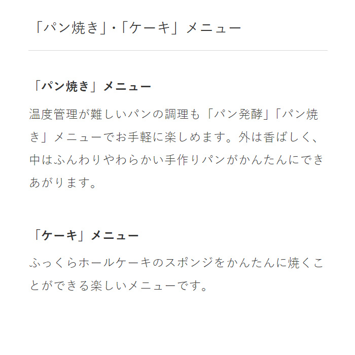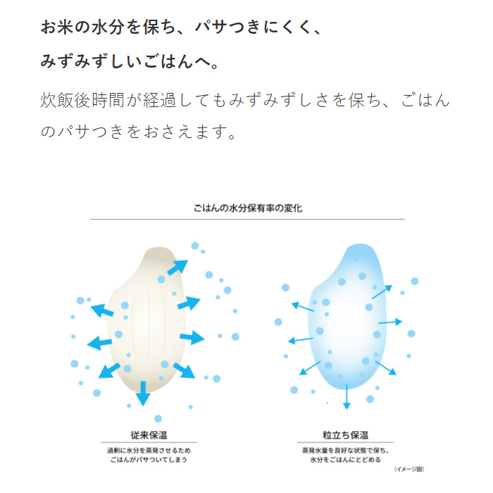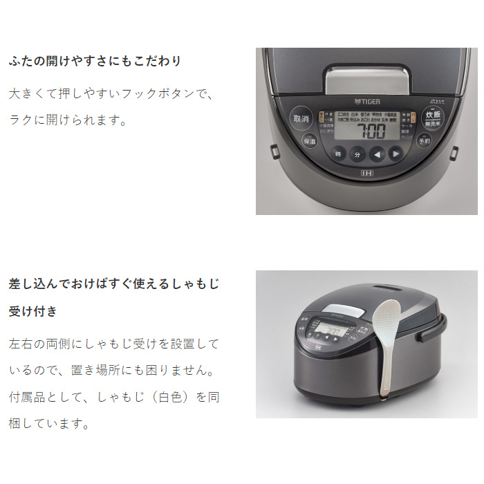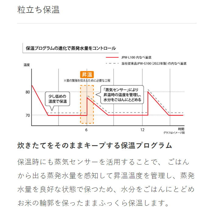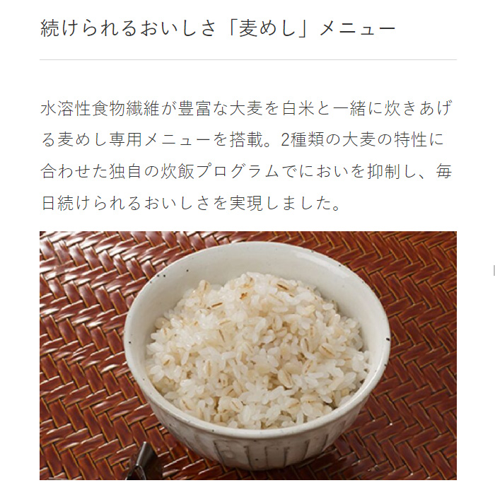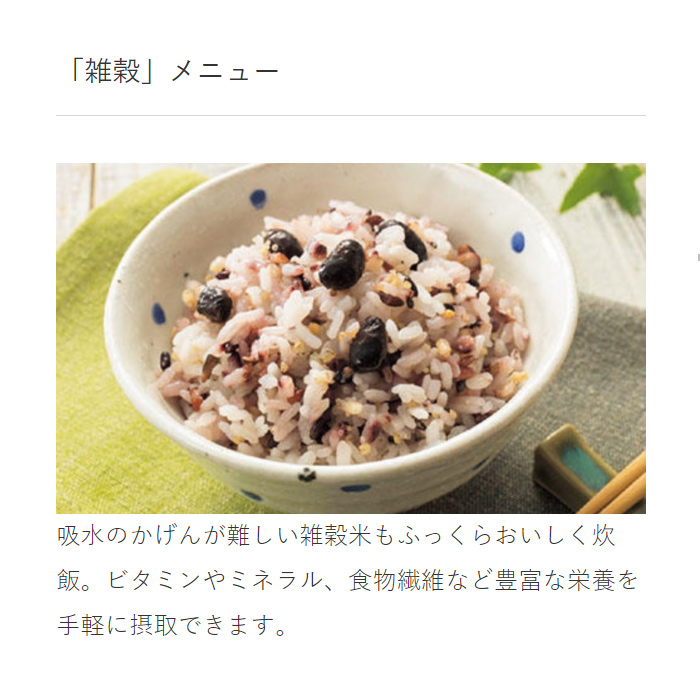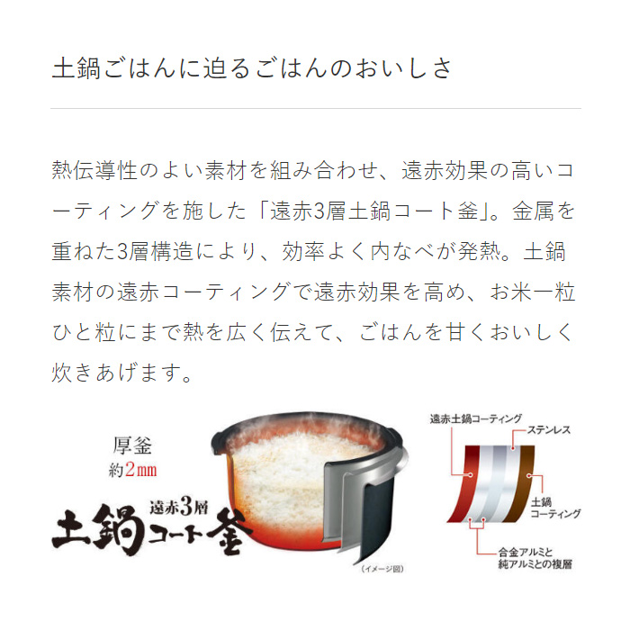 ■土鍋ごはんに迫るごはんのおいしさ熱伝導性のよい素材を組み合わせ、遠赤効果の高いコーティングを施した「遠赤3層土鍋コート釜」。金属を重ねた3層構造により、効率よく内なべが発熱。土鍋素材の遠赤コーティングで遠赤効果を高め、お米一粒ひと粒にまで熱を広く伝えて、ごはんを甘くおいしく炊きあげます。■長くご使用いただけるように、内なべ内面コーティングの3年保証を行います。※内なべの内面コーティングが対象です。取扱説明書の記載事項にそわない使い方をされた場合は対象外です。■極うま強火IHお米本来の甘みと旨みを引き出す「極うま強火IH」。高加熱で内なべの底と側面から、内なべ全体を強火で包み込んで加熱し、芯までふっくら炊きあげます。また約110~115度の高温蒸らしで、お米のα化を促進し、本来の甘みと旨みを引き出します。■メニュー○エコ炊き○白米○極うま○少量炊き○早炊き○少量高速○おにぎり○冷凍ご飯○炊込み・炊込みおこげ○おかゆ○玄米○雑穀○麦めし押麦○麦めしもち麦○おこわ○調理○ケーキ○パン発酵○パン焼き■粒立ち保温炊きたてをそのままキープする保温プログラム保温時にも蒸気センサーを活用することで、 ごはんから出る蒸発水量を感知して昇温温度を管理し、蒸発水量を良好な状態で保つため、水分をごはんにとどめお米の輪郭を保ったままふっくら保温します。■お米の水分を保ち、パサつきにくく、みずみずしいごはんへ。炊飯後時間が経過してもみずみずしさを保ち、ごはんのパサつきをおさえます。■炊飯器調理にも対応!時短調理にも役立つ「調理」メニューを搭載。火を使わずに加熱できるので材料を入れてキーを押すだけで一品が完成します。■お手入れ部品はたったの2点。部品の取り外しもかんたん。(1)内なべ(2)内ぶた毎日のお手入れを最低限に。内ぶたの取り外しもかんたんで、毎日のお手入れをらくにしていただけます。■内なべとっ手つき内なべにとっ手がついているので、取り外しやすく、持ち運びにも便利です。■定格電圧:100V■定格周波数:50-60Hz■加熱方式:極うま強火IH■白米の炊飯及び保温米飯容量:1合-1升■容量:1.8L■定格消費電力:1,375W■最大炊飯容量区分:D■年間消費電力量:138kWh/年■1回当りの炊飯時消費電力量:225Wh/回■1時間当りの保温時消費電力量:23.7Wh/時■サイズ 幅×奥行×高さ(約):28.8×38.6×23.9(cm)■ふた開き時の高さ (約):46.6(cm)■質量 (約):5kg■省エネ基準達成率:105%■ラベル: 目標年度2008年度■コードの長さ(約):1m