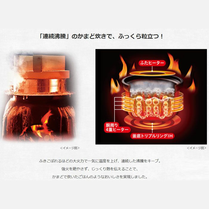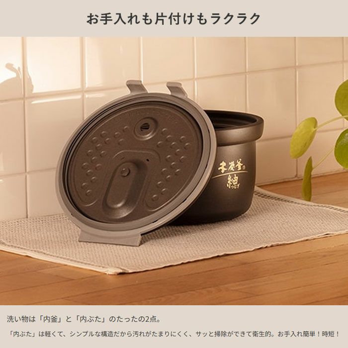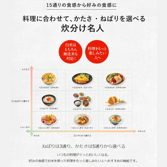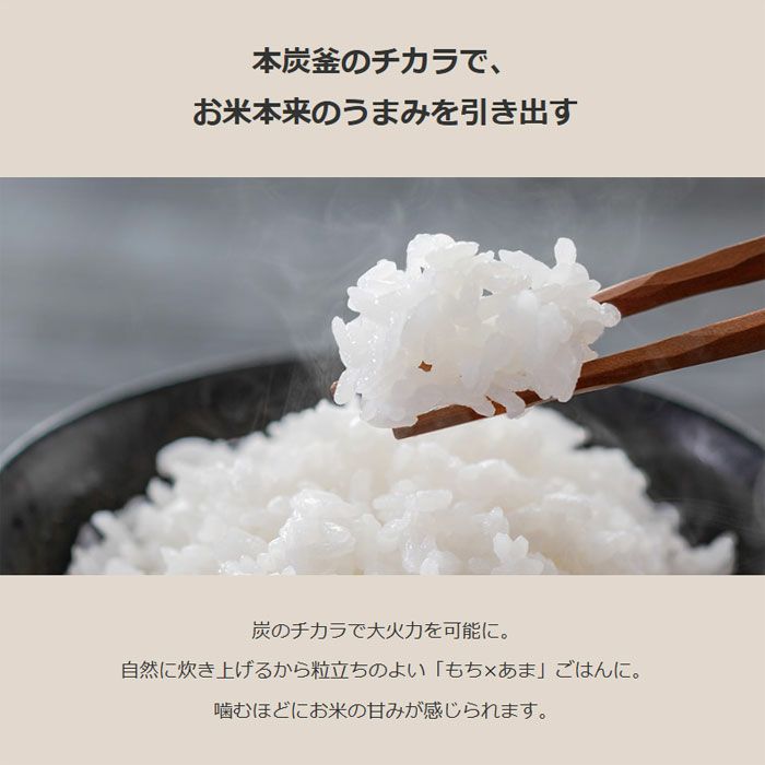 本炭釜のチカラで、お米本来のうまみを引き出す■「連続沸騰」のかまど炊きで、ふっくら粒立つ!ふきこぼれるほどの大火力で一気に温度を上げ、連続した沸騰をキープ。強火を絶やさず、じっくり熱を伝えることで、かまどで炊いたごはんのようなおいしさを実現しました。■健康とおいしさを両立する、からだ想いの炊飯器白米、玄米、発芽米、雑穀米はもちろん、麦飯やダイズライスも専用モードで手軽に炊飯。日々の食事から、健康を支えます。■好きな銘柄のお米を、好みの食感に炊き上げる同じ品種でも、産地の気候風土や米農家さんの栽培方法で食味はさまざま。さらに、好みに合わせて9通りの食感を設定できます。■高タンパク、低カロリーな料理もラクラクジッパー付き食品保存袋に材料を入れて、低温調理水位線まで水を入れる。低温調理ボタンを押して温度と時間を設定したら、スイッチオン!ヘルシーなおかずを幅広く楽しめます。■ねばりは3通り、かたさは5通りから選べるいつもの料理がぐっとおいしくなる。好みの食感でお米を使った料理をもっと楽しみたい人へおすすめの機能です。■まとめ炊き(冷凍用)モード忙しくてもおいしさに妥協したくない方に!冷凍モードでおいしく保存。パッと手軽に、炊き立てのようなおいしいごはん。■うま早・お急ぎモード忙しい毎日でも、おいしいごはんが食べたい。三菱電機独自の炊飯技術により、わずかな時間でも、お米を大火力で一気に炊き上げることができます。この炊飯器には選べるふたつの早炊きモードを搭載しています。■少量名人少量の繊細な火加減をうまくお米に伝えて、一杯分だけでもちゃんとおいしい。≪炭≫■内釜:本炭釜 紬■内面(フッ素)コート:100万回洗米ハードコート■外面コート:炭■胴周り炭コート:●■放熱板(内ぶた)炭コート:●≪火力≫■連続沸騰:●■ヒーター(全面加熱):八重■熱密封かまど構造:本・熱密封■ダイレクトセンサー:●≪吸水≫■本炭吸水:●≪選べる保温≫■保温切:●■たべごろ保温※2:●■一定保温※3:●≪炊き分け≫■炊飯メニュー詳細:白米・無洗米・胚芽米・発芽米・分づき米・玄米・炊込み(白米/無洗米/発芽米/分づき米/玄米)・雑穀米(白米/無洗米/発芽米/分づき米/玄米)・おかゆ・中華粥(白米/無洗米)・おこわ・すし(白米/無洗米)・おこげ(白米/無洗米)・麦飯(白米/無洗米)・長粒米・炒飯・ダイズライス■かまど炊き(白米・無洗米)※4:●■芳潤炊き(白米・無洗米)※4:銘柄芳潤炊き(50銘柄)■芳潤炊き(玄米)※5:●■芳潤炊き(発芽米)※6:●■芳潤炊き(麦飯)※5:●≪炊飯モード≫■炊分け名人(白米・無洗米)※4:●■炊分け(玄米)※5:美容玄米、金のいぶき、芳潤炊き、玄米冷凍■少量名人(白米・無洗米)※7:●■まとめ炊き(冷凍用)※4:●■玄米冷凍用※5:●■炒飯※8:●■エコ炊飯(白米・無洗米)※4:●■長粒米※5:●■分づき米(専用モード)※6:●■ダイズライス※5:●■うま早(白米・無洗米)、お急ぎ(白米・無洗米)※8:●■金のいぶき(玄米)※5:●■低温調理:●(65℃~85℃、5~180分で調理可)■特大液晶&デカ文字:フルドット&バックライト■ブラック液晶:●■音声ナビ:●■計量カップ:合ピタカップ■自立式しゃもじ:●■Vピタ目盛:●■予約1・予約2:●■かんたん予約:●■洗う部品点数:2点(内釜、内ぶた)■フレームフラット:●■抗菌:●(ふた開きボタン)※9■最大消費電力(W):1400■1回あたりの炊飯時消費電力量(Wh/回)※10:161.9(白米・エコ炊飯)■1時間あたりの保温時消費電力量(Wh)※10:17.4■外形寸法〈幅×奥行×高さ/ふた開け時高さ〉(mm):261×315×257/484■質量(約kg):5.7■区分名※11:B※1 内釜内面コート(フッ素加工)の保証期間は、お買上げ日から3年間です。(取扱説明書の記載事項にそわない使い方をした場合は対象外となります。)内釜の割れ・ヒビ・欠け、内釜外面コートのはがれ等は保証期間内でも「有料」となります。※2 保温温度を低めにしています。12時間を過ぎると、自動的に保温温度が高めになります。※3 高めの温度で24時間一定にキープします。※4 0.5~5.5合まで対応しています。※5 1~3合まで対応しています。※6 1~4合まで対応しています。※7 0.5~2合まで対応しています。※8 0.5~3合まで対応しています。※9 無機抗菌剤、塗装、ふた開きボタン。試験機関:(一財)ボーケン品質評価機構、試験方法:JIS Z 2801に基づく、抗菌方式:抗菌剤(ふた開きボタン)、試験結果:99%以上※10 消費電力量は、炊飯量、ご使用のメニュー等によって異なります。※11 区分名について A:電磁誘導加熱方式(最大炊飯容量0.54L以上、0.99L未満のもの) B:電磁誘導加熱方式(最大炊飯容量0.99L以上、1.44L未満のもの) C:電磁誘導加熱方式(最大炊飯容量:1.44L以上、1.8L未満のもの) D:電磁誘導加熱方式(最大炊飯容量:1.8L以上のもの)