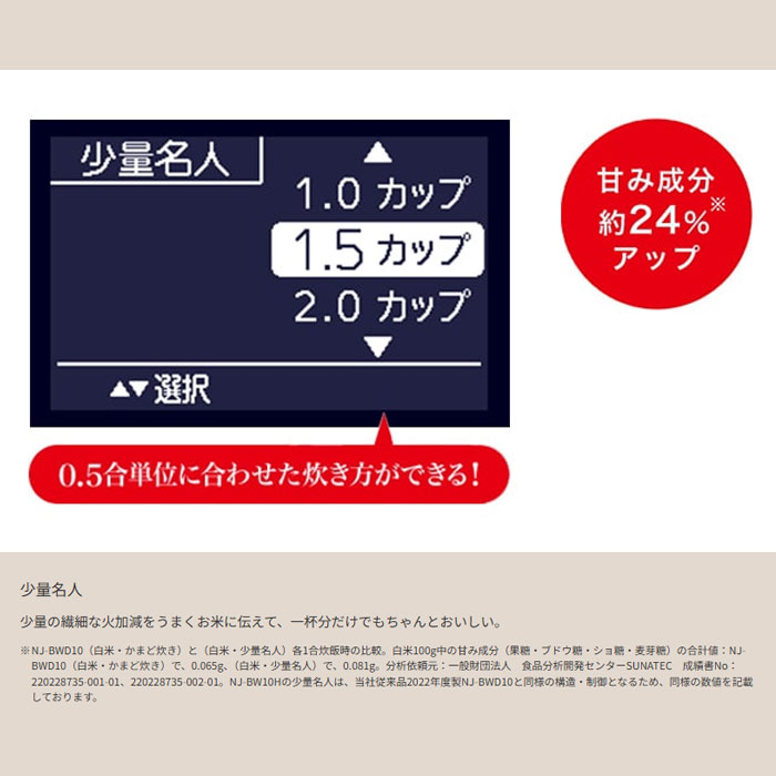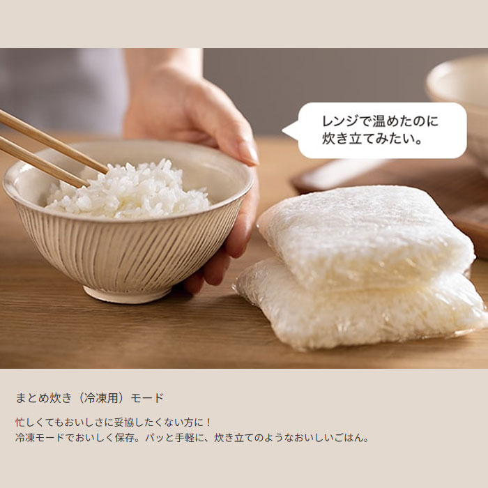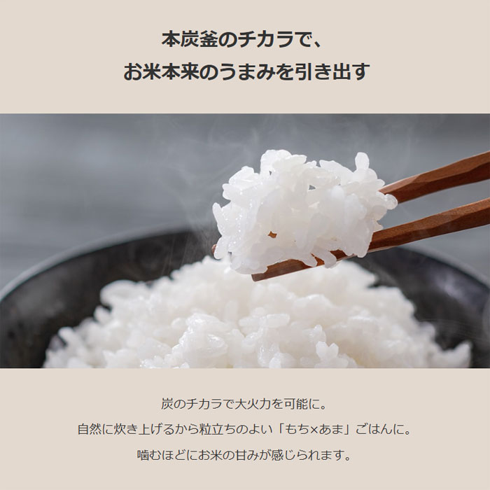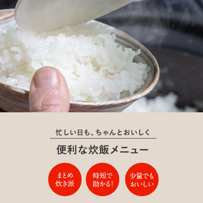 本炭釜のチカラで、お米本来のうまみを引き出す■「連続沸騰」のかまど炊きで、ふっくら粒立つ!ふきこぼれるほどの大火力で一気に温度を上げ、連続した沸騰をキープ。強火を絶やさず、じっくり熱を伝えることで、かまどで炊いたごはんのようなおいしさを実現しました。■健康とおいしさを両立する、からだ想いの炊飯器白米、玄米、発芽米、雑穀米はもちろん、麦飯やダイズライスも専用モードで手軽に炊飯。日々の食事から、健康を支えます。■好きな銘柄のお米を、好みの食感に炊き上げる同じ品種でも、産地の気候風土や米農家さんの栽培方法で食味はさまざま。さらに、好みに合わせて9通りの食感を設定できます。■高タンパク、低カロリーな料理もラクラクジッパー付き食品保存袋に材料を入れて、低温調理水位線まで水を入れる。低温調理ボタンを押して温度と時間を設定したら、スイッチオン!ヘルシーなおかずを幅広く楽しめます。■ねばりは3通り、かたさは5通りから選べるいつもの料理がぐっとおいしくなる。好みの食感でお米を使った料理をもっと楽しみたい人へおすすめの機能です。■まとめ炊き(冷凍用)モード忙しくてもおいしさに妥協したくない方に!冷凍モードでおいしく保存。パッと手軽に、炊き立てのようなおいしいごはん。■うま早・お急ぎモード忙しい毎日でも、おいしいごはんが食べたい。三菱電機独自の炊飯技術により、わずかな時間でも、お米を大火力で一気に炊き上げることができます。この炊飯器には選べるふたつの早炊きモードを搭載しています。■少量名人少量の繊細な火加減をうまくお米に伝えて、一杯分だけでもちゃんとおいしい。≪炭≫■内釜:本炭釜 紬■内面(フッ素)コート:100万回洗米ハードコート■外面コート:炭■胴周り炭コート:●■放熱板(内ぶた)炭コート:●≪火力≫■連続沸騰:●■ヒーター(全面加熱):八重■熱密封かまど構造:本・熱密封■ダイレクトセンサー:●≪吸水≫■本炭吸水:●≪選べる保温≫■保温切:●■たべごろ保温※2:●■一定保温※3:●≪炊き分け≫■炊飯メニュー詳細:白米・無洗米・胚芽米・発芽米・分づき米・玄米・炊込み(白米/無洗米/発芽米/分づき米/玄米)・雑穀米(白米/無洗米/発芽米/分づき米/玄米)・おかゆ・中華粥(白米/無洗米)・おこわ・すし(白米/無洗米)・おこげ(白米/無洗米)・麦飯(白米/無洗米)・長粒米・炒飯・ダイズライス■かまど炊き(白米・無洗米)※4:●■芳潤炊き(白米・無洗米)※4:銘柄芳潤炊き(50銘柄)■芳潤炊き(玄米)※5:●■芳潤炊き(発芽米)※6:●■芳潤炊き(麦飯)※5:●≪炊飯モード≫■炊分け名人(白米・無洗米)※4:●■炊分け(玄米)※5:美容玄米、金のいぶき、芳潤炊き、玄米冷凍■少量名人(白米・無洗米)※7:●■まとめ炊き(冷凍用)※4:●■玄米冷凍用※5:●■炒飯※8:●■エコ炊飯(白米・無洗米)※4:●■長粒米※5:●■分づき米(専用モード)※6:●■ダイズライス※5:●■うま早(白米・無洗米)、お急ぎ(白米・無洗米)※8:●■金のいぶき(玄米)※5:●■低温調理:●(65℃~85℃、5~180分で調理可)■特大液晶&デカ文字:フルドット&バックライト■ブラック液晶:●■音声ナビ:●■計量カップ:合ピタカップ■自立式しゃもじ:●■Vピタ目盛:●■予約1・予約2:●■かんたん予約:●■洗う部品点数:2点(内釜、内ぶた)■フレームフラット:●■抗菌:●(ふた開きボタン)※9■最大消費電力(W):1400■1回あたりの炊飯時消費電力量(Wh/回)※10:161.9(白米・エコ炊飯)■1時間あたりの保温時消費電力量(Wh)※10:17.4■外形寸法〈幅×奥行×高さ/ふた開け時高さ〉(mm):261×315×257/484■質量(約kg):5.7■区分名※11:B※1 内釜内面コート(フッ素加工)の保証期間は、お買上げ日から3年間です。(取扱説明書の記載事項にそわない使い方をした場合は対象外となります。)内釜の割れ・ヒビ・欠け、内釜外面コートのはがれ等は保証期間内でも「有料」となります。※2 保温温度を低めにしています。12時間を過ぎると、自動的に保温温度が高めになります。※3 高めの温度で24時間一定にキープします。※4 0.5~5.5合まで対応しています。※5 1~3合まで対応しています。※6 1~4合まで対応しています。※7 0.5~2合まで対応しています。※8 0.5~3合まで対応しています。※9 無機抗菌剤、塗装、ふた開きボタン。試験機関:(一財)ボーケン品質評価機構、試験方法:JIS Z 2801に基づく、抗菌方式:抗菌剤(ふた開きボタン)、試験結果:99%以上※10 消費電力量は、炊飯量、ご使用のメニュー等によって異なります。※11 区分名について A:電磁誘導加熱方式(最大炊飯容量0.54L以上、0.99L未満のもの) B:電磁誘導加熱方式(最大炊飯容量0.99L以上、1.44L未満のもの) C:電磁誘導加熱方式(最大炊飯容量:1.44L以上、1.8L未満のもの) D:電磁誘導加熱方式(最大炊飯容量:1.8L以上のもの)