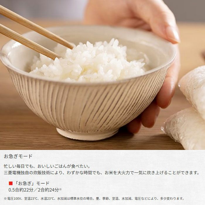 ■こだわりの便利機能うま早モード吸水工程を確保して炊飯することで早炊きでもふっくらと甘みのあるごはんに炊き上げます。■お急ぎモード忙しい毎日でも、おいしいごはんが食べたい。三菱電機独自の炊飯技術により、わずかな時間でも、お米を大火力で一気に炊き上げることができます。■お手入れも片付けもラクラク洗い物は内釜と内ぶたのたったの2点。毎日使うものだから、こだわりぬいた使いやすさ。■お米のうまみを引き出すから、冷めてもおいしい。お弁当やおにぎり、お寿司などにもぴったりです。三菱IHジャー炊飯器の「超音波吸水」は、ごはんのおいしさを超音波技術で大幅に進化させ、市場から高い評価を得たことが認められました(平成17年度受賞)。■備長炭コートと連続沸騰■炭の力で大火力を均一に伝え、粒立ちよくふっくら炊き上げ。甘みとうまみを引き出します。ふきこぼれるほどの大火力で一気に温度を上げ、連続した沸騰をキープ。断熱材を追加することで、熱を外に逃がさず、温度をキープ。強火を絶やさず、じっくり熱を伝えることで、かまどで炊いたごはんのようなおいしさを実現しました。■うれしい炊き分けモードお米の個性を引き出す多彩な炊飯モードを搭載。栄養たっぷりの玄米や麦飯も、手間なくふっくら炊き上げます。■胴周り炭コート■内蔵カートリッジ■繊細な火加減のコントロール「ダイレクトセンサー」■フラットだからお手入れしやすい■すっきり収納のコンパクトボディー■見やすい液晶■合ピタカップ(計量カップ)■Vピタ目盛■内釜洗米■エコ炊飯モード≪炭≫■内釜:備長炭 炭炊釜■内面(フッ素)コート:100万回洗米ハードコート■外面コート:備長炭■胴周り炭コート:●≪火力≫■連続沸騰:●■ヒーター(全面加熱):五重■ダイレクトセンサー:●≪吸水≫■超音波吸水:可変≪選べる保温≫■保温切:●■たべごろ保温※2:●■一定保温※3:●≪炊き分け炊飯モード≫■炊飯メニュー詳細:白米・無洗米・発芽米・玄米・炊込み(白米/無洗米/発芽米/玄米)・雑穀米(白米/無洗米/発芽米/玄米)・おかゆ・おこわ・すし(白米/無洗米)・麦飯(白米/無洗米)・エコ炊飯■芳潤炊き(白米・無洗米)※4:●■エコ炊飯(白米・無洗米)※5:●■うま早(白米・無洗米)※6:●■お急ぎ(白米・無洗米)※6:●■もちもち(白米・無洗米)※4:●■特大液晶&デカ文字:グレー■計量カップ:合ピタカップ■自立式しゃもじ:●■Vピタ目盛:●■予約1・予約2:●■かんたん予約:●■お手入れラクラク:洗う部品点数 2点(内釜、内ぶた)■最大消費電力(W):710■1回あたりの炊飯時消費電力量(Wh/回)※7:126.8■1時間あたりの保温時消費電力量(Wh)※7:14.9■外形寸法〈幅×奥行×高さ/ふた開け時高さ〉(mm):231×289×204/406■質量(約kg):4.1■区分名※8:A※1 内釜内面コート(フッ素加工)の保証期間は、お買上げ日から3年間です。(取扱説明書の記載事項にそわない使い方をした場合は対象外となります。)内釜外面コートのはがれ等は保証期間内でも「有料」となります。※2 保温温度を低めにしています。12時間を過ぎると、自動的に保温温度が高めになります。※3 高めの温度で24時間一定にキープします。※4 最小から最大炊飯容量まで対応しています。※5 1~3合まで対応しています。※6 0.5~2合まで対応しています。※7 消費電力量は、炊飯量、ご使用のメニュー等によって異なります。※8 区分名について A:電磁誘導加熱方式(最大炊飯容量:0.54L以上、0.99L未満のもの) B:電磁誘導加熱方式(最大炊飯容量:0.99L以上、1.44L未満のもの) C:電磁誘導加熱方式(最大炊飯容量:1.44L以上、1.8L未満のもの) D:電磁誘導加熱方式(最大炊飯容量:1.8L以上のもの)