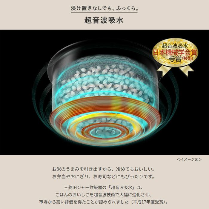 ■こだわりの便利機能うま早モード吸水工程を確保して炊飯することで早炊きでもふっくらと甘みのあるごはんに炊き上げます。■お急ぎモード忙しい毎日でも、おいしいごはんが食べたい。三菱電機独自の炊飯技術により、わずかな時間でも、お米を大火力で一気に炊き上げることができます。■お手入れも片付けもラクラク洗い物は内釜と内ぶたのたったの2点。毎日使うものだから、こだわりぬいた使いやすさ。■お米のうまみを引き出すから、冷めてもおいしい。お弁当やおにぎり、お寿司などにもぴったりです。三菱IHジャー炊飯器の「超音波吸水」は、ごはんのおいしさを超音波技術で大幅に進化させ、市場から高い評価を得たことが認められました(平成17年度受賞)。■備長炭コートと連続沸騰■炭の力で大火力を均一に伝え、粒立ちよくふっくら炊き上げ。甘みとうまみを引き出します。ふきこぼれるほどの大火力で一気に温度を上げ、連続した沸騰をキープ。断熱材を追加することで、熱を外に逃がさず、温度をキープ。強火を絶やさず、じっくり熱を伝えることで、かまどで炊いたごはんのようなおいしさを実現しました。■うれしい炊き分けモードお米の個性を引き出す多彩な炊飯モードを搭載。栄養たっぷりの玄米や麦飯も、手間なくふっくら炊き上げます。■胴周り炭コート■内蔵カートリッジ■繊細な火加減のコントロール「ダイレクトセンサー」■フラットだからお手入れしやすい■すっきり収納のコンパクトボディー■見やすい液晶■合ピタカップ(計量カップ)■Vピタ目盛■内釜洗米■エコ炊飯モード≪炭≫■内釜:備長炭 炭炊釜■内面(フッ素)コート:100万回洗米ハードコート■外面コート:備長炭■胴周り炭コート:●≪火力≫■連続沸騰:●■ヒーター(全面加熱):五重■ダイレクトセンサー:●≪吸水≫■超音波吸水:可変≪選べる保温≫■保温切:●■たべごろ保温※2:●■一定保温※3:●≪炊き分け炊飯モード≫■炊飯メニュー詳細:白米・無洗米・発芽米・玄米・炊込み(白米/無洗米/発芽米/玄米)・雑穀米(白米/無洗米/発芽米/玄米)・おかゆ・おこわ・すし(白米/無洗米)・麦飯(白米/無洗米)・エコ炊飯■芳潤炊き(白米・無洗米)※4:●■エコ炊飯(白米・無洗米)※5:●■うま早(白米・無洗米)※6:●■お急ぎ(白米・無洗米)※6:●■もちもち(白米・無洗米)※4:●■特大液晶&デカ文字:グレー■計量カップ:合ピタカップ■自立式しゃもじ:●■Vピタ目盛:●■予約1・予約2:●■かんたん予約:●■お手入れラクラク:洗う部品点数 2点(内釜、内ぶた)■最大消費電力(W):710■1回あたりの炊飯時消費電力量(Wh/回)※7:126.8■1時間あたりの保温時消費電力量(Wh)※7:14.9■外形寸法〈幅×奥行×高さ/ふた開け時高さ〉(mm):231×289×204/406■質量(約kg):4.1■区分名※8:A※1 内釜内面コート(フッ素加工)の保証期間は、お買上げ日から3年間です。(取扱説明書の記載事項にそわない使い方をした場合は対象外となります。)内釜外面コートのはがれ等は保証期間内でも「有料」となります。※2 保温温度を低めにしています。12時間を過ぎると、自動的に保温温度が高めになります。※3 高めの温度で24時間一定にキープします。※4 最小から最大炊飯容量まで対応しています。※5 1~3合まで対応しています。※6 0.5~2合まで対応しています。※7 消費電力量は、炊飯量、ご使用のメニュー等によって異なります。※8 区分名について A:電磁誘導加熱方式(最大炊飯容量:0.54L以上、0.99L未満のもの) B:電磁誘導加熱方式(最大炊飯容量:0.99L以上、1.44L未満のもの) C:電磁誘導加熱方式(最大炊飯容量:1.44L以上、1.8L未満のもの) D:電磁誘導加熱方式(最大炊飯容量:1.8L以上のもの)