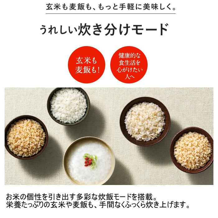 お米の個性を引き出す多彩な炊飯モードを搭載。栄養たっぷりの玄米や麦飯も、手間なくふっくら炊き上げます。