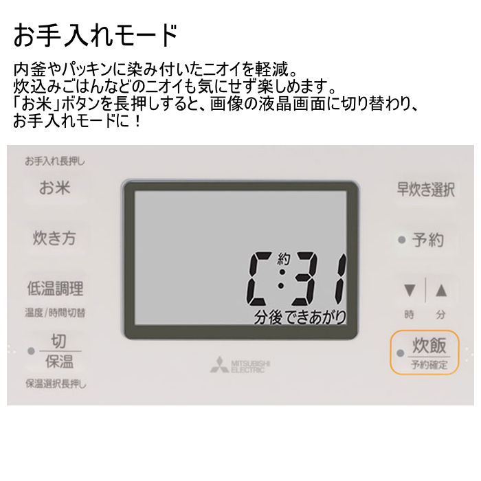 内釜やパッキンに染み付いたニオイを軽減。炊込みごはんなどのニオイも気にせず楽しめます。「お米」ボタンを長押しすると、画像の液晶画面に切り替わり、お手入れモードに!