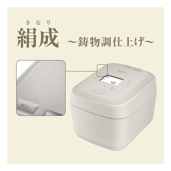■めざしたのは、八代目儀兵衛のひと粒のうまさ。この本当においしいごはんをご家庭に届けたい。京の米老舗 八代目儀兵衛が理想とする炊き上がりを、炊飯器で実現しました。■圧力&スチームの日立!最高1.5気圧大火力で沸騰、圧力&スチームで蒸らす。[圧騰甘み炊き]■おいしく炊くには、高い「発熱性」「伝熱性」「蓄熱性」が大切です。[大火力 沸騰鉄釜]■蒸気がほとんど出ないから置き場所に困らない。高級感のある仕上げで暮らしに調和。[蒸気カット]&高級感のあるデザイン■基本的な性能・型式:圧力&スチームIHタイプ・炊飯容量:1.0L(5.5合)/0.09~1.0L・圧力・スチーム:最高1.5気圧・スチーム・全周断熱構造:●・ヒーター:底面IHヒーター、側面ヒーター、ふたヒーター・内釜:大火力 沸騰鉄釜 【内釜】軽量 約790g 【内釜】カーボンフッ素 6年保証・水位線:おこのみ水位線と大きな合数文字・蒸気カット/蒸気セーブ:蒸気カット■炊飯コース・出荷時設定コース:エコ炊飯・炊飯できるお米:白米/無洗米/雑穀米/玄米/発芽玄米/麦ごはん(押し麦/もち麦)・極上コース(しゃっきり/ふつう/もちもち):白米/無洗米/雑穀米/玄米/麦ごはん・極上コース(新米):白米/無洗米・極上コース(すしめし):白米/無洗米・冷凍用コース:白米/無洗米・少量炊飯:0.5~1合または1.5~2合の選択可能(設定対応コース:極上コース、快速)・その他コース:快速/炊込み/おかゆ/おこわ■保温・保温時間(「保温低」設定時):スチーム保温40時間■お手入れ/使いやすさ・洗浄部品点数:3点(?ふた加熱板/?オートスチーマープレート/・内釜) ※?は食器洗い乾燥機対応・凹凸が少ないフレーム:●・抗菌:ふた操作部、フックボタン*2・操作部液晶:ホワイトLEDバックライト付き大型液晶・予約炊飯:2メモリー■付属品/寸法・質量/設置 など・付属品:コンパクトしゃもじ(自立式)、計量カップ・消費電力:炊飯(W):1,400・白米炊飯時消費電力量(Wh/回)出荷時:エコ炊飯 153*5・白米炊飯時消費電力量(Wh/回)最大:極上もちもち 181*5・外形寸法:幅×奥行×高さ(cm):24.8×30.2×23.4・ふたを開いたときの高さ(cm):44.7・質量(約)(kg):6.0■省エネ法関連の仕様一覧・区分名:B*6・省エネ基準達成率 %:103・年間消費電力量 kWh/年:81.2・最大炊飯容量 L:1.0・炊飯時消費電力量(1回当たり) Wh:153・保温時消費電力量(1時間当たり) Wh:16.6*1 取扱説明書の記載と異なる使い方をされた場合は保証対象外となります。*2 試験依頼先:一般財団法人 ボーケン品質評価機構 ●試験方法:JIS Z 2801(フィルム密着法) ●試験結果:抗菌活性値2.0以上(抗菌活性値2.0以上で抗菌効果があるとされています。) 〈フレーム〉●抗菌方法:塗装 ●試験番号:20218060791-1(2019年2月18日発行) 〈ふた操作部〉●抗菌方法:印刷 ●試験番号:25021001512-1(2021年5月28日発行) 〈フックボタン〉●抗菌方法:樹脂に練り込み ●試験番号:213223133-1(2013年10月4日発行)、26025000371-1(2025年7月11日発行)*3 試験依頼先:一般財団法人 ボーケン品質評価機構 ●試験方法:JIS Z 2801(フィルム密着法) ●試験結果:抗菌活性値2.0以上(抗菌活性値2.0以上で抗菌効果があるとされています。) 〈フックボタン〉●抗菌方法:樹脂に練り込み ●試験番号:213223133-1(2013年10月4日発行)、25021002629-1(2021年8月20日発行)*4 試験依頼先:一般財団法人 ボーケン品質評価機構 ●試験方法:JIS Z 2801(フィルム密着法)●試験結果:抗菌活性値2.0以上(抗菌活性値2.0以上で抗菌効果があるとされています。) 〈 フックボタン〉●抗菌方法:樹脂に練り込み ●試験番号:20224013933-1(2024年7月5日発行)、20224008183-1(2024年7月2日発行)*5 1.0L(5.5合)炊きタイプ0.54L(3合)炊飯時1回当たりの消費電?量。*6 区分名について B?電磁誘導加熱?式(最?炊飯容量が0.99L以上、1.44L未満のもの)○ 医療用ペースメーカーをお使いの方は、IHジャー炊飯器をご使用の際には、専門医師とよくご相談のうえ、お使いください。