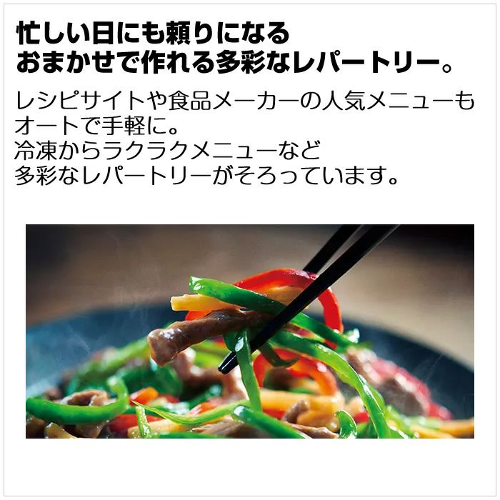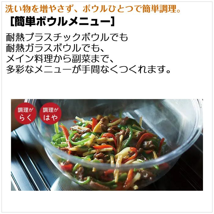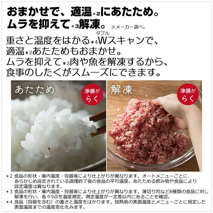 ◎最高310℃※1熱風コンベクションオーブン[2段]新登場※1 短時間運転*1。300℃、310℃は予熱有り時のみ設定可。※熱風コンベクションオーブン2段は手動のみ。■クワトロ加熱で焼き上げ。食材を並べてあとはおまかせ。冷凍からも火加減おまかせ。[熱風旨み焼き] セラミック製のテーブルプレートで、マイクロ波を使ったレンジ加熱、オーブン、過熱水蒸気、グリルの複合加熱(クワトロ加熱)でおいしく調理。■大火力でこんがり焼き上げ。[310℃※1熱風コンベクションオーブン2段] ダブル光速ヒーターとファンの力で、熱風で包み込むようにおいしく焼き上げます。多彩なスイーツも自宅で手軽に作れます。※1 短時間運転*1。300℃、310℃は予熱有り時のみ設定可。※熱風コンベクションオーブン2段は手動のみ。■洗い物を増やさず、ボウルひとつで簡単調理。[簡単ボウルメニュー] 耐熱プラスチックボウルでも耐熱ガラスボウルでも、メイン料理から副菜まで、多彩なメニューが手間なくつくれます。■調理後の庫内お手入れがらくに。[らくメンテ] 毎日使うものだから、お手入れも操作もラクなオーブンレンジを。■おまかせで、適温*2にあたため。ムラを抑えて*3解凍。※メーカー調べ。 重さと温度をはかる*4Wダブルスキャンで、適温*2あたためもおまかせ。ムラを抑えて*3肉や魚を解凍するから、食事のしたくがスムーズにできます。■わかりやすいフルドット液晶搭載。 ダイヤルとメニュー名表示で操作しやすい。メニューの付属品もイラストで表示します。■よく使うメニューを登録。簡単呼び出し。[マイリストボタン] よく使うメニューやお気に入りのメニューをマイリストに登録すると、2回目以降はマイリストボタンを押すだけで簡単に呼び出すことができます。■スマホとつなげて新しいレシピの提案も。ごちそうのレパートリーを増やしていける。 あなたの好みにあわせて、おすすめのレシピを毎日提案してくれます。さらに、新しいレシピも配信されるため、選べるメニューが次々と増えていきます。■忙しい日にも頼りになるおまかせで作れる多彩なレパートリー。 レシピサイトや食品メーカーの人気メニューもオートで手軽に。冷凍からラクラクメニューなど多彩なレパートリーがそろっています。■おうちの調味料で作れるオートメニューを食品メーカーとコラボ。 おいしさにこだわる食品メーカーとコラボ。おうちの調味料を使って、おいしいメニューが、簡単に作れます。*1 240~310℃の運転時間は約5分間です。その後は自動的に230℃に切りかわります。300℃、310℃は予熱有り時のみ設定できます。*2 食品の形状・庫内温度・容器等により仕上がりが異なります。オートメニューごとに、あらかじめ設定されている調理終了後の食品の平均温度。あたためる飲み物や食品により設定温度は異なります。*3 食品の形状・庫内温度・容器等により仕上がりが異なります。薄切り肉など8種類の食品に対し解凍を行い、各々9点を温度測定。測定温度が一定差以内にあることを確認。*4 食品(容器を含む)の重さと温度をはかります。加熱前の表面温度とメニューごとに規定した表面温度までの温度変化をみます。≪基本的な性能≫■タイプ:過熱水蒸気オーブンレンジ■総庫内容量・庫内形状:30L*1 ワイド&フラット庫内■センサー種類:Wスキャン(重量センサー+センター赤外線センサー)+温度センサー≪加熱方式≫■レンジ 最高出力:1,000W*2(手動:最大5分間/自動:最大3分間)■オーブン 最高温度(自動):310℃※2 方式:熱風コンベクション式 ヒーター:ダブル光速ヒーター 段数:2段 ※2 短時間運転*4。300℃、310℃は予熱有り時のみ設定可。■グリル:大火力平面グリル■スチーム:給水タンク式■過熱水蒸気:ボイラー熱風式≪メニュー≫■レシピ数:292■オートメニュー数:242*6■熱風旨み焼き:35■やわらかメニュー:-■食品メーカーコラボレシピ:23■ボウルメニュー:簡単ボウルメニュー 84■スピードメニュー:58■最短1分スピードメニュー:8■ノンフライ:17■セットメニュー:4≪使いやすさ≫■2品同時あたため:●■トースト(2枚まで):(オート:途中で裏返し)約5~6分■庫内灯:LED庫内灯×2灯■表示部:フルドット液晶(バックライト付き)■簡単操作:ボタン一体型ダイヤル、簡単レンジボタン、マイリストボタン■スマートフォン連携:ヘルシーシェフアプリ≪お手入れ≫■庫内底面:外して丸洗いテーブルプレート■庫内側面・背面・天面:汚れを落としやすい庫内側面、お手入れしやすい平面グリルヒーター■コース:清掃・脱臭・水抜き≪付属品/寸法・質量/設置≫■付属品:外して丸洗いテーブルプレート、角皿 410×300mm 2枚、焼網■本体外形寸法(ハンドル含む):幅497×奥行442(495)×高さ375(mm)■設置(設置時に確保する放熱スペース):左右・背面 壁ピッタリ、上方10cm以上*7*8■庫内有効寸法(幅×奥行×高さ):401×322×218(mm)■質量:約18.0kg≪基本仕様・性能≫■電源:AC100V(50-60Hz)■オーブン 出力:1,360W 消費電力:1,400W 温度調節:100~250℃・300℃・310℃(240~310℃は短
