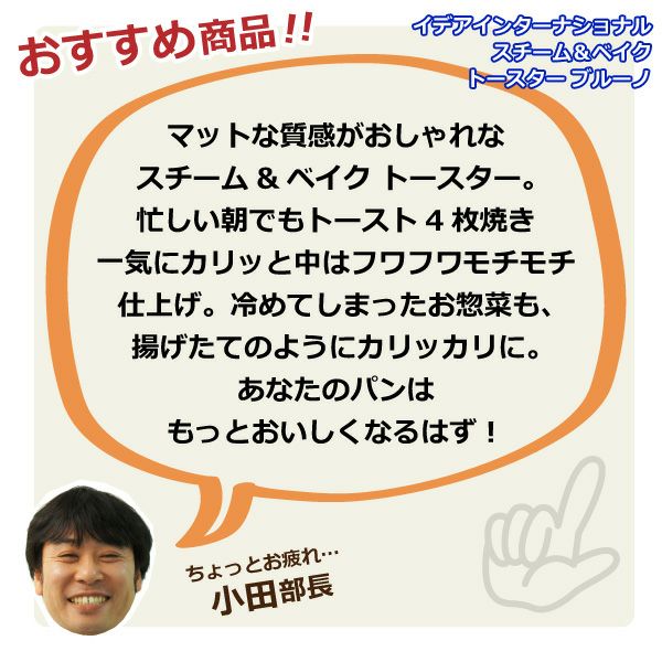 他の画像を見る 送料無料・代引き手数料無料 BRUNO スチーム&ベイク トースター ブルーノ BOE067-BK ブラック イデアインターナショナル 当店特別価格 ¥ 18,480 税込 在庫切れ 送料無料・代引き手数料無料 詳細を見る お気に入りに登録する
