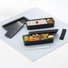 ■大人も子供も使いやすい!ハシ付きのお弁当箱 汁もれしにくいシンプルデザインのお弁当箱。フタの端を押すと簡単にフタが開いてハシが取り出せます。2段式です。食洗器対応。