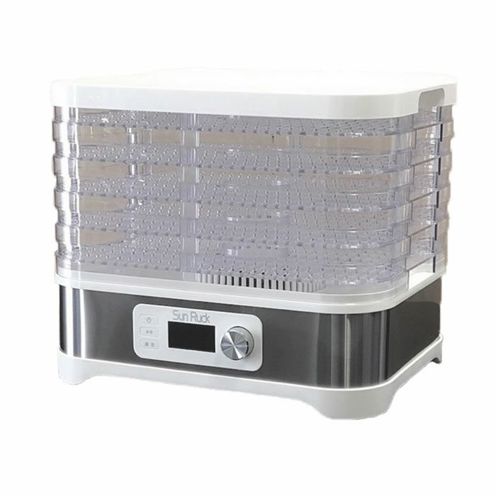 大容量!5段トレイのフードドライヤー無添加自家製ドライフルーツ美容や健康に良いとされているドライフードをフードドライヤーで簡単に作ることができます。自分で作れば好きな食材で思い通りのドライフードを楽しめます。天日干しと異なり、天候や鳥や虫を気にせず、いつでも自分の好きなタイミングで短時間で作ることができます!乾燥して食べるだけじゃない食材を乾燥してからドライフードとしてそのまま食べるだけでなく家庭料理やケーキなどのお菓子作りにも大活躍!野菜やフルーツなどを乾燥して保存すれば、普段は数日しか持たない食材でもしっかり乾燥させることで数ヶ月~数年持つようになります。食品ロス削減にもつながります!大容量5段トレイ大容量5段トレイで家族分も一度に作れるので時短になります。トレイの高さは調節可能。同じ段数でもトレイ端のツメの向きを変えることで高さが変わります。食材の厚みによって高さを変えられ、効率よく温風を行き渡らせることが可能です。タイマー1時間~24時間まで30分刻みで設定可能です。タイマー終了後は自動でシャットダウンされるので一晩乾燥したい時に便利です。温度調節温度は35~70℃まで5℃刻みで調節が可能。食材によって温度調節しお好みの乾燥具合に。高温乾燥で乾燥時間の短縮にもなります。乾燥ムラになりにくい消費電力400Wで最高温度を70℃まで設定することができます。機器全体に熱が回るので、乾燥の度合いにムラができにくいのも嬉しいポイントです。高温でしっかり加熱・乾燥させるのでジャーキー作りにおすすめ。消費電力が400Wと省エネなのも魅力的です。簡単操作で使いやすい1.食材を薄く切ります。2.食材をトレイに並べます。3.乾燥時間と温度を設定。4.ボタンを押してスタート!後は乾燥を待つだけ。フードドライヤーで下記の食材が楽しめます!ハーブ キノコ 野菜 フルーツ フラワーティー ナッツ ジャーキー 干魚 などアイシングクッキーの乾燥にも!デザインにこだわったアイシングクッキーは自然乾燥で作ると時間がかかって大変です。フードドライヤーを使えば乾燥時間短縮に!コンパクトなデザインで置き場に困らない。幅320mm、奥行260mmの大きさの設置面積はA4用紙とほぼ同じです。(A4用紙のサイズは210×297mm)省スペース設計で小さめのキッチンでも楽々収納できます!【注意事項】仕様、及びデザインは改良のため予告なく変更する場合があります。ご覧になっているモニター・パソコン等の環境によって多少色味が異なる場合がございます。予めご了承ください。【仕様】サイズ(約):幅32×奥行26×高さ22~27.5cm重量(約):4kg電源コード長(約):1m材料:ABS、PP定格電圧:AC100-110V 50/60Hz消費電力:400Wタイマー設定時間:1時間~24時間 ※30分刻み温度設定:35℃~70℃※5℃刻み電気代の目安:消費電力400Wに対して6時間稼働時:約63.5円/8時間稼働時:約84.7円(2023年1月21日現在のもの 東京電力:26.48円から算出しています。)※個別の電気代へのご質問はお受けしておりません。予めご了承下さい。付属品:トレイ×5、フタ、取扱説明書(保証書付き)