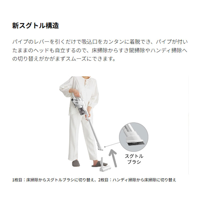 パイプのレバーを引くだけで吸込口をカンタンに着脱でき、パイプが付いたままのヘッドも自立するので、床掃除からすき間掃除やハンディ掃除への切り替えがかがまずスムーズにできます。