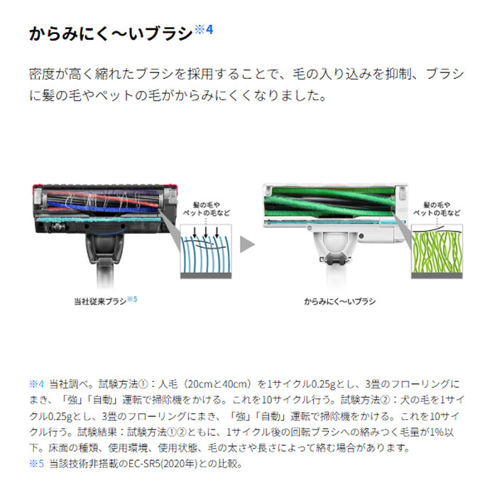 ※8 メーカー調べ。試験方法[1]:人毛(20cmと40cm)を1サイクル0.25gとし、3畳のフローリングにまき、「強」「自動」運転で掃除機をかける。これを10サイクル行う。試験方法[2]:犬の毛を1サイクル0.25gとし、3畳のフローリングにまき、「強」「自動」運転で掃除機をかける。これを10サイクル行う。試験結果:試験方法[1][2]ともに、1サイクル後の回転ブラシへの絡みつく毛量が1%以下。床面の種類、使用環境、使用状態、毛の太さや長さによって絡む場合があります。