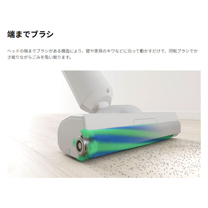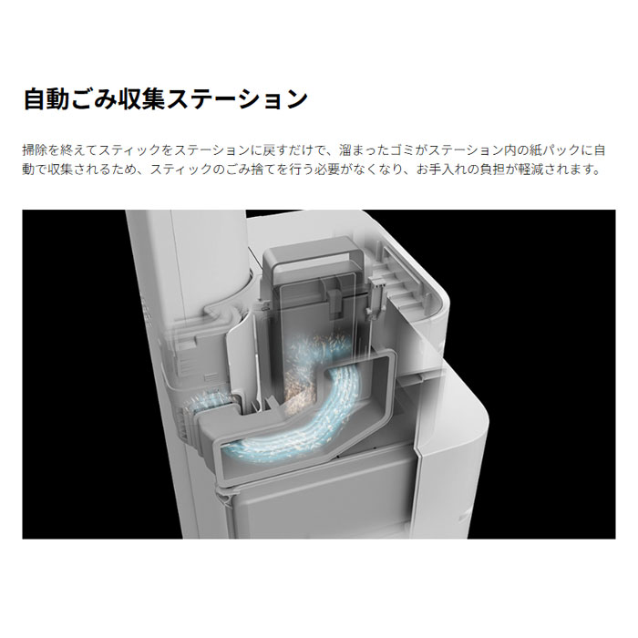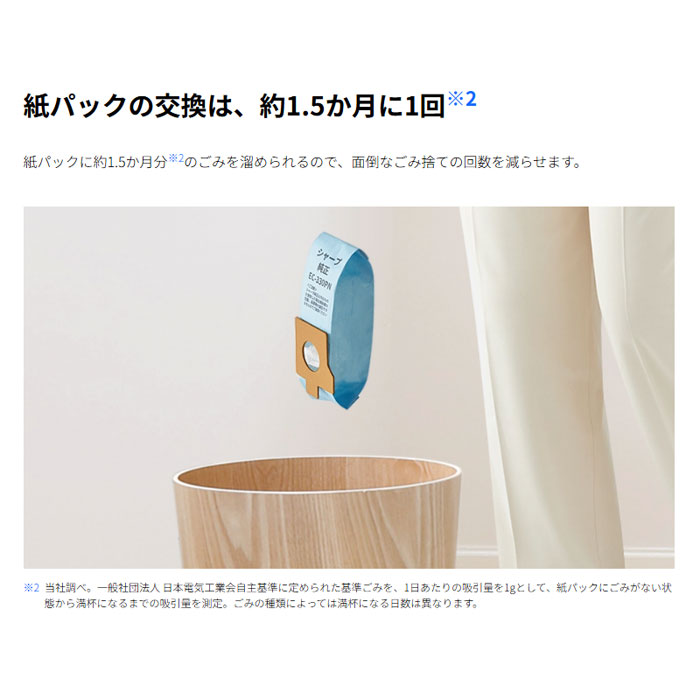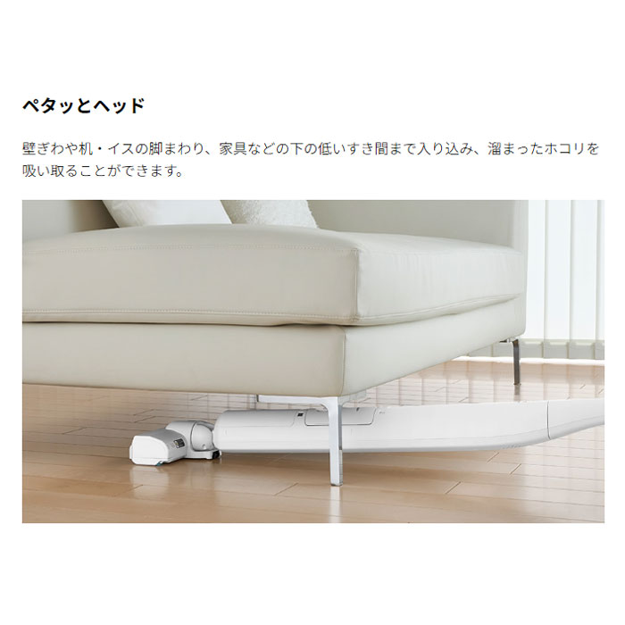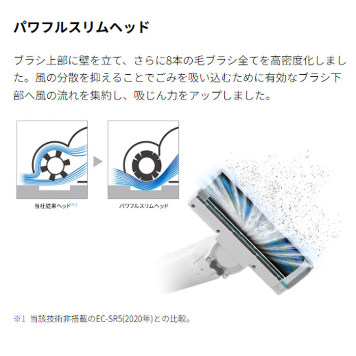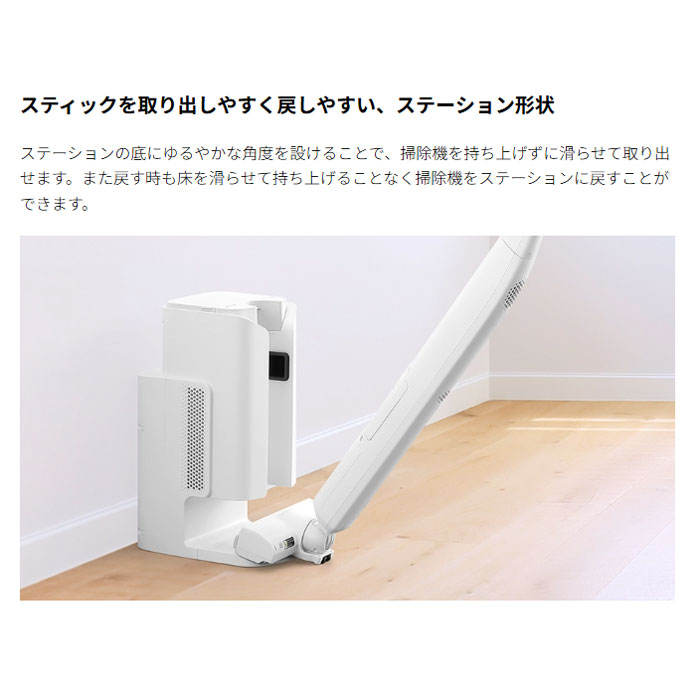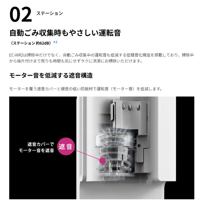 ■驚きの吸引力細かなごみまでしっかりと吸込み、やさしい運転音と驚きの吸引力の両立を実現しました。■パワフルスリムヘッドブラシ上部に壁を立て、さらに8本の毛ブラシ全てを高密度化しました。風の分散を抑えることでごみを吸い込むために有効なブラシ下部へ風の流れを集約し、吸じん力をアップしました。■掃除中もやさしい運転音(スティック強モード時約62dB)独自の低騒音化技術により、掃除中の運転音と運転時に不快に感じる耳障りな音を抑制しているので、周りも時間も気にせずラクに清潔にお掃除いただけます。■モーター音と排気音を低減モーターを覆う遮音カバーでモーター音を低減するとともに、長尺の排気経路で排気音を減衰させます。 運転時に不快に感じる耳障りな音を抑制し、やさしい運転音を実現しました。■駆動音を低減するダンピングコントロール吸込口の主な振動源に防振材を配置することで、振動を抑え、駆動音を低減します。■自動ごみ収集時もやさしい運転音(ステーション 約62dB)EC-WR2は掃除中だけでなく、自動ごみ収集中の運転音も低減する低騒音化構造を搭載しており、掃除中から後片付けまで周りも時間も気にせずラクに清潔にお掃除いただけます。■モーター音を低減する遮音構造モーターを覆う遮音カバーと硬度の低い防振材で運転音(モーター音)を低減します。■排気音を低減する長尺排気経路長尺の排気経路で排気を減衰することで排気音を低減します。■自動ごみ収集ステーション掃除を終えてスティックをステーションに戻すだけで、溜まったゴミがステーション内の紙パックに自動で収集されるため、スティックのごみ捨てを行う必要がなくなり、お手入れの負担が軽減されます。■パックinカップ構造抗菌加工ダストカップに紙パックを装着する「パックinカップ」構造だから、紙パックにさわらずボタンを押すだけでごみ捨てが可能。また、新しい紙パックの装着もラクに行え、本体から外したダストカップはまるごと水洗いできます。■紙パックの交換は、約1.5か月に1回紙パックに約1.5か月分のごみを溜められるので、面倒なごみ捨ての回数を減らせます。■端までブラシヘッドの端までブラシがある構造により、壁や家具のキワなどに沿って動かすだけで、回転ブラシでかき取りながらごみを吸い取ります。■スティックを取り出しやすく戻しやすい、ステーション形状ステーションの底にゆるやかな角度を設けることで、掃除機を持ち上げずに滑らせて取り出せます。また戻す時も床を滑らせて持ち上げることなく掃除機をステーションに戻すことができます。■持ちやすくて握りやすい、ハンドル形状ゆるやかなラウンド形状で自然な角度で持ちやすく、また2カ所にひっかかりがあるので握りやすい安定感のあるハンドル形状を採用しています。■ペタッとヘッド壁ぎわや机・イスの脚まわり、家具などの下の低いすき間まで入り込み、溜まったホコリを吸い取ることができます。■運転音:スティック使用時:約62~56dB*/ステーション自動ごみ収集時:約62dB※1■標準質量(本体質量):スティック:1.5(1.2)kg*※2/ステーション:3.8kg■本体寸法(幅×奥行×高さ)・スティック:221×134×997mm・ステーション:200×289×435mm・収納時:221×289×1,015mm■最長連続運転時間*・標準モード:約30分※3・自動モード:約7分~約20分※3・強モード:約7分※3■バッテリー(リチウムイオン電池):14.4V 1730mAh/内蔵式バッテリー(ユーザー交換可)■充電方式:ステーション(充電スタンド)/コード長 1.0m■充電時間*:約80分※4■消費電力:自動ごみ収集中:約360W/充電中:約29W/充電完了後:約0.5W■集じん容積:スティック:0.05L※5/ステーション:0.37L※6■集じん方式:スティック:紙パックレス式、ステーション:紙パック式■モーター:軽量モーター■吸込口・パワーヘッド (自走パワーアシスト※7)・パワフルスリムヘッド・ペタッとヘッド・端までブラシ・からみにく~いブラシ※8・から拭きパワーブラシ■排気クリーン:スティック:フィルター(水洗い可能)、ステーション:抗菌※93層紙パック■ダストカップ:スティック:ワンタッチ着脱ケース、ステーション:着脱カップ/抗菌加工※10■スティック:遮音構造・長尺排気経路、ダンピングコントロール■ステーション:遮音構造・長尺排気経路■ごみ捨て:スティック:ごみ捨て不要 ステーション:自動ごみ収集/パックinカップ構造■水洗い:スティック:回転ブラシ・フィルターケース ステーション:ダストカップ■掃除機能:床面検知(自動モード)*JEMA自主基準(HD-10)により測定。※1 自社基準により測定。※2 標準質量は本体、バッテリー、吸込口、ハンドルの合計質量です。本体質量はハンドル、バッテリーを含む本体のみの質量です。※3 室温20℃、満充電、電池初期、標準の吸込口を使用時に測定した最長運転時間。床面の種類、使用環境、使用状態により異なります。※4 測定は室温20℃。充電時聞は周辺温度、使用条件などによって異なります。※5 メーカー純正本体フィルター