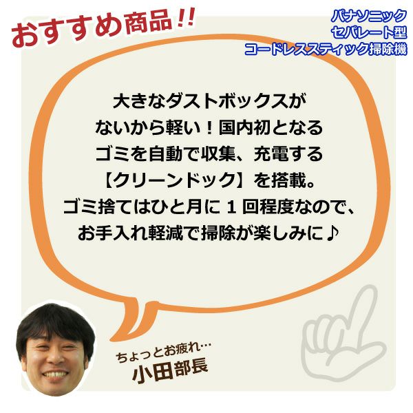 他の画像を見る 送料無料・代引き手数料無料・延長保証申込可 パナソニック コードレススティック掃除機 MC-SBV01-W ホワイト 当店特別価格 ¥ 18,600 税込 送料無料・代引き手数料無料・延長保証申込可 カートに入れる お気に入りに登録する