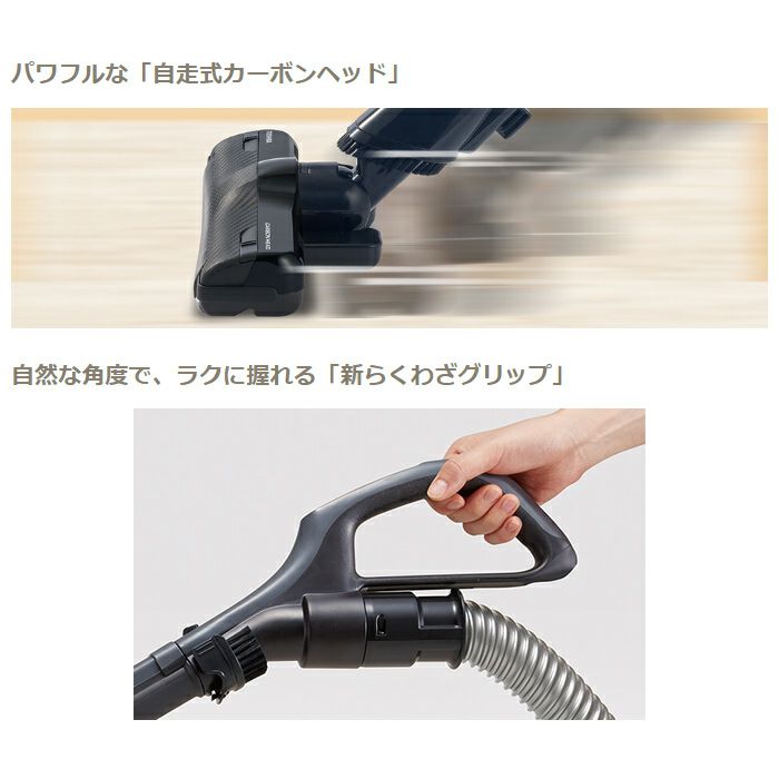 ■コンパクトなボディで強い吸引力が続く■デュアルトルネードシステム■カーボンヘッド■新らくわざグリップ■2WAYブラシ■集じん機能:デュアルトルネードシステム 水洗い可(フィルター、ダストカップ)■集じん容積:0.25L■吸込仕事率(消費電力):290W~約20W(850W~約120W)■本体質量※1(標準質量)※4:2.2kg(3.6kg)■運転音※5:63dB~約58dB■排気性能:粒子径0.5μm以上の微細塵を約99%捕塵※6■コードの長さ:5.0m■本体寸法(幅×奥行×高さ):220×295×255mm■ヘッドのタイプ:カーボンヘッド、モーター式 自走式、床ピタ設計、抗菌ブラシ、水洗い可(ブラシ、お手入れカバー)■付属品:すき間ノズル、お手入れブラシ※1.本体質量は本体のみの質量です。(コード付掃除機は電源コードを含む本体のみの質量です)※2.ダストカップにゴミがない状態からゴミすてラインまでの風量の持続性が99%以上。長期のご使用の際は、サイクロン部のフィルターのお手入れが必要です。ゴミの種類や条件によって異なります。※3.使用環境や使用時間、ゴミの種類によっては付着する場合があります。4.(標準質量)は本体・ホース・延長管・ヘッドの合計質量です。※5.「運転音」の表示は、JIS C 9108による。※6.メーカー排気粉塵試験による。