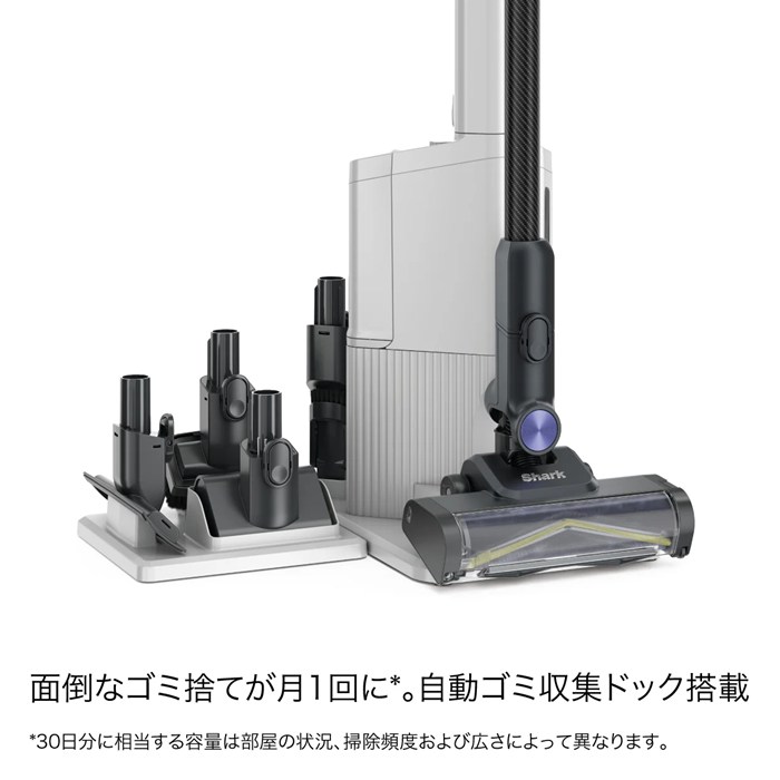 ■360°クリーニングを実現するシャーク独自の「360インテリジェントノズル」搭載■シャーク独自のアクティブフラップで後ろに引いた時もゴミをしっかり吸引■2.2kg以下のコードレス掃除機で最も優れた掃除力*1■iQセンサーがゴミの量に合わせて吸引力を自動調整することで、効率的にお掃除できる■フロアセンサーが床材に合わせてブラシの回転速度を自動調整し、最適な状態で掃除できる■エッジセンサーが壁際を検知して吸引力が最大2倍アップ*2することで取り残しを防ぐ■髪の毛やペットの毛が絡まないテクノロジー*3搭載■よりコンパクトになったヘッドによる滑らかな操作性を実現■曲がるパイプ「Flex」搭載で立ったままラクにお掃除■ドックに戻すだけでゴミを自動収集。ゴミ捨て時にホコリが舞い上がらない■約30日ゴミ捨て不要*4■HEPAフィルターが細かいホコリやアレルゲンを99.99%*5ドックに閉じ込める■部屋に出しておきたくなるカッコよさと美しさを兼ね備えたスタイリッシュなデザイン■自動ゴミ収集ドックに置くだけで簡単充電・簡単収納■取り外せて水洗い可能なダストカップ、フィルター、ブラシロール■2年保証(バッテリー等消耗品除く)■運転時間コードレススティックでの使用時・iQモード:約7分~38分・エコモード:約38分ハンディでの使用時・ブーストモード:約8分・iQモード:約8分~45分・エコモード:約45分■充電時間:約4.5時間■アクセサリー/パーツ・ブラシ付き隙間用ノズル・ペットマルチノズル・布団ノズル・ミニモーターヘッド・自動ゴミ収集ドック(充電機能付き)・アクセサリードック・リチウムイオンバッテリー 1個■消費電力(W):260W(本体のみ)/300W(パイプおよび電動フロアノズル装着時)■コードレススティックの製品サイズ(高さ x 幅 x 奥行):1080 x 228 x 321 mm■ハンディ本体の製品サイズ(高さ x 幅 x 奥行):336 x 89 x 245 mm■収納時の製品サイズ(高さ x 幅 x 奥行):1109 x 230 x 350 mm■化粧箱サイズ(高さ x 幅 x 奥行):710 x 387 x 280 mm■コードレススティック本体重量:約2.2kg■ハンディ本体重量:約1.2kg■ドック重量:約3.0kg■充電コード長さ:1.2m■ダストカップ容量:0.4L(自動ゴミ収集ドック:1.3L)■バッテリー本体重量:340g*1 IEC 62885-2, 62885-4 5.1/5.2/5.3/5.4/5.5に則りフローリング及びカーペットでの測定結果の平均値に基づき、2024年2月から2025年1月まで自社調べにおける販売台数上位10製品との比較。*2 自社テストによる。エコモード時の吸引力との比較。*3 自社テストによる。長さ15cmの毛10グラムをカーペットから取り除くテストの結果。*4 30日分に相当する容量は部屋の状況、掃除頻度および広さによって異なります。*5 0.3-10μmの粒子におけるASTM F1977-22に基づく。