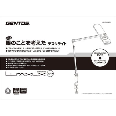 ブルーライト軽減・太陽光に近い光(Ra95)のクランプ式デスクライトです。AC電源を使用。ワイド発光で広範囲を照らします(JIS AA形相当)。■使用光源:高演色(Ra95)チップタイプ白色LED×32個、高演色(Ra95)チップタイプ暖色LED×32個 ■明るさ(約):昼白色【5000K】1800~450ルーメン(無段階調節)、白色【4000K】1700~400ルーメン(無段階調節)、電球色【3000K】1400~350ルーメン(無段階調節) ■直下照度(40cm最大時):3800ルクス ■入力電圧:DC12V ■入力電流:1000mAh ■消費電力:12W ■電源:ACアダプター(入力:AC100-240V 50/60Hz、出力:DC12V 1A) ■本体サイズ(約):(セード)W500.0×H12.5×D80.0mm、(アーム1)415.0mm、(アーム2)480.5mm(本体凸部含む) ■本体質量(約):1435g