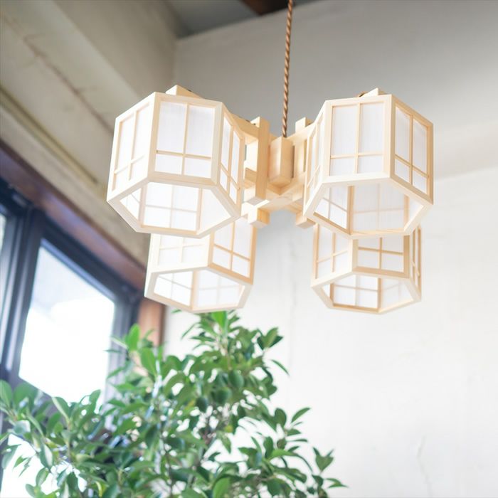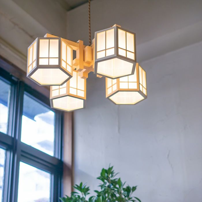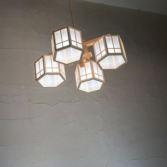 キューブ型のシェードがついた、斬新であたたかみのあるシャンデリア。