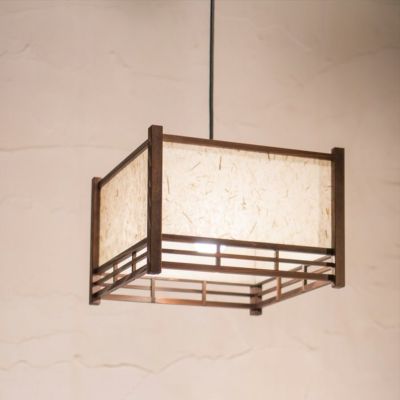 太く直線的な組子の、ちょっと懐かしい和風のデザイン。 ワーロンと色のバリエーションが増えました。■規格:E26 100W 白熱電球付■寸法:□320 高225 コード長600 [全長825]■仕様:黒丸打ちコード(引掛シーリング)フレンジカバー付■材質:日本杉 民芸塗装仕上/ワーロン(B:スサ入)/金属BSメッキ(ソケットカバー)■生産国:日本
