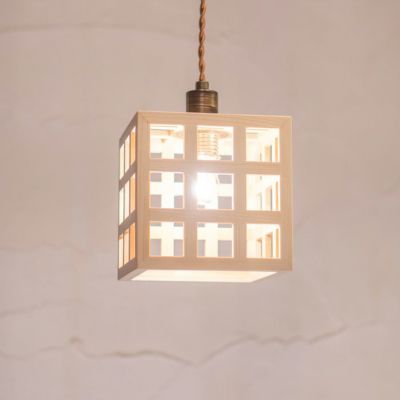 ■規格:E17 60W 白熱電球付■寸法:□140 高185 コード長600 [全長785]■仕様:金茶撚線コード(引掛シーリング) フレンジカバー付(白)■材質:檜/金属BSメッキ(ソケットカバー)■生産国:日本
