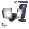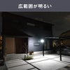 ■ライト部がスライド式で照射方向が自由に調節できます。真下を照らしたり、ライトを片側に寄せて照らすことも自由自在。■日照不足でソーラー発電が不足したときはUSBから充電できます。安定した点灯を維持できるソーラー式センサーライトです。■バッテリー残量が20%を切るとライトの明るさを自動で下げることで充電不足による不点灯を防止します。■100%の明るさのパワーモードと50%の明るさのエコモードが選択切替できます。■ライトが点滅するフラッシュ発光モードも搭載しています。■本体サイズ:幅約171×奥行約170×高さ約128mm(ライト垂直時の最大値)、ソーラーパネル:幅約103×奥行約50×高さ約188mm■本体重量:約435g(本体)、約270g(ソーラーパネル)■電源 / 充電池:リチウムイオン電池3.6V 3600mAh(充電池交換不可)■充電時間:5.5時間※定格が1A以上/5VのUSB充電器と付属USBケーブルで充電した場合■1日平均点灯回数:明るさ100%点灯時:春夏秋 平均約50回・冬 平均約35回 満充電時約340回、明るさ50%点灯時:春夏秋 平均約100回・冬 平均約70回 満充電時約680回※春夏秋=充電可能な平均日照時間約3時間、冬=平均日照時間約2時間(東京)■充電寿命:充放電サイクル300回■電球:7.5W×3 (高輝度白色LED設計寿命4万時間)、全光束:1800ルーメン■センサー:探知方式 焦電型赤外線センサー、探知範囲 最大140° 最遠8m ※取り付け高さ2.0m■点灯時間設定:10秒(100% / 50% / フラッシュ)■点灯切替機能:昼・・・周囲が明るくても暗くても点灯、夜・・・周囲が暗い時のみ点灯、OFF・・・電源オフ■設置場所:屋内・屋外用 (保護等級 IP44)■付属品:取り付けネジ×4 / コンクリート用プラスティックプラグ×4 / USBケーブル(Type-C、充電用、長さ25cm)※USB充電器は付属しておりません。■ソーラーパネル:種類 結晶太陽電池、出力 5V/1.6W、コード長さ 5m
