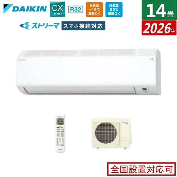 他の画像を見る ☆工事費込☆最大5年間延長保証申し込み可能! エアコン 14畳用 4.0kW 200V 工事費込み ダイキン CXシリーズ 2026年モデル S406ATCV-W-SET ホワイト 室外電源モデル S406ATCV-W-ko2 当店特別価格 ¥ 198,800 税込 ☆工事費込☆最大5年間延長保証申し込み可能! 詳細を見る お気に入りに登録する