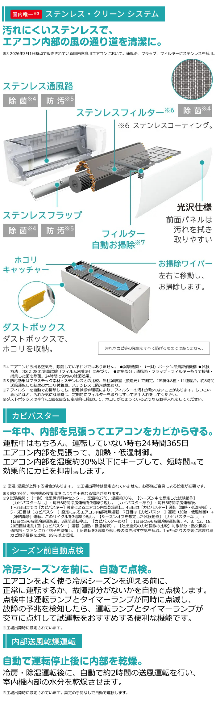 ※9 試験機関:(一財)北里環境科学センター。室温約27℃、湿度約70%。【シーズン中を想定した試験動作】[カビバスターなし]:毎日6時間冷房運転を3週繰り返し。[カビバスターあり]:毎日6時間冷房運転後、1~3日目までは[カビバスター]設定によるエアコン内部乾燥運転。4日目は[カビバスター]運転(加熱・低湿制御)、5・6日目は[カビバスター]設定によるエアコン内部乾燥運転、7日目は[カビバスター]運転(加熱・低湿制御)+[凍結洗浄]運転。このサイクルを3週繰り返し。【シーズンオフを想定した試験動作】[カビバスターなし]:1日目のみ6時間冷房運転後、3週間運転停止。[カビバスターあり]:1日目のみ6時間冷房運転後、4、8、12、16、20日目は定刻1回[カビバスター]運転(加熱・低湿制御)。【吐出空気のカビ個数の比較】対象部分:熱交換器・通風路・ファンにカビ胞子を塗布し、上記運転を3週繰り返し後の吹き出す空気を採取。1m3当たりの空気に含まれるカビ胞子個数を比較。99%以上低減。