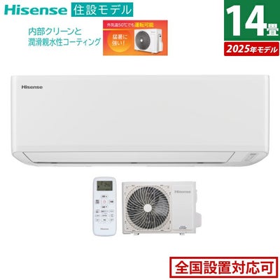 ■2025年モデル■室内機+室外機のセット冷房暖房兼用のスタンダードエアコン■夏でも冬でも快適冷房暖房兼用モデルハイセンスの住設モデルは、季節を問わず使える「冷房暖房兼用モデル」。暑い夏は涼しく、寒い冬は暖かく、365日快適な暮らしが続きます。■イヤなニオイを抑える内部クリーン機能と潤滑親水性コーティング冷房や除湿運転で内部に残った水分をしっかり乾燥。さらに、ニオイを吸着しにくい熱交換器コーティングを採用。カビやニオイの発生を抑えます。※自動運転・暖房・送風の運転停止時には内部クリーンは作動しません。■外気温50℃でも安心猛暑に強い室外機外気温50℃の環境下で、 実使用を考慮した性能試験を実施した室外機は猛暑でも使用が可能。猛暑の夏でも安定した運転を実現。※外気温とは室外機の吸い込み温度です。冷房することは確認済みです(能力を保証するものではありません)。使用環境・設置状況によって、冷房能力は低下することがあります。室外機周辺が高温になることがあります。所定の設置スペースを確保してください。■就寝時に便利なバックライト付きリモコン暗闇でも見やすいバックライト機能で、就寝前後も快適に操作が可能です。※ボタン操作時のバックライト点灯は約3秒となります。【主な仕様】■電源:単相200V・20A■電源プラグ:エルバー型■畳数の目安:冷房 11~17/暖房 11~14■能力(kW):冷房 4.0/暖房 5.0■室内機寸法:H282mm×W780mm×D236mm■室外機寸法:H590mm×W810(+91)mm×D280(+57)mm※( )内は突起物の寸法です。