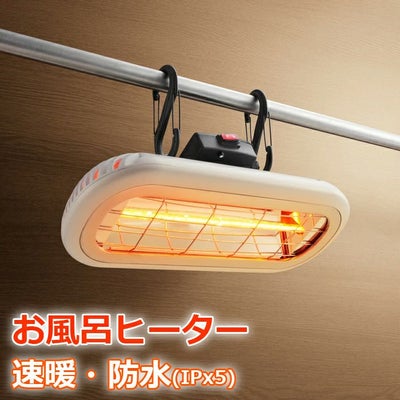 ■既存の浴室に設置できる“お風呂ヒーター”■使用中に水・お湯がかかっても大丈夫■わずか1秒で暖かくなる速暖性■設置方法は、ランドリーパイプに吊り下げたり、DIYで設置■電源ケーブルは、」脱衣洗面のコンセントにも届く6mのロング仕様■電源スイッチは製品本体と電源プラグ部の2か所に搭載■サーモスタット搭載で、異常発熱時は安全に電源OFF■電源:100V 50/60Hz■消費電力:1000W■寸法:幅460mm×奥行き115mm×高さ190mm(突起部含む)■質量:約2kg■付属品:吊り下げ用フック、壁固定用金具