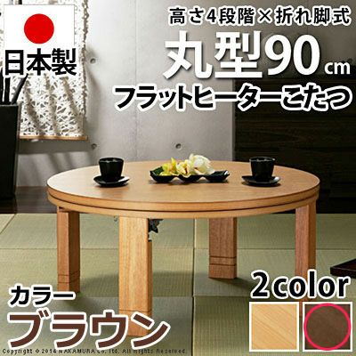 メーカー直送・送料無料!おしゃれこたつ 高さ4段階調節つき 天然木丸型折れ脚こたつ フラットロンド 径90cm こたつ 円形 フラットヒーター マストバイ 11100378-br ブラウン
